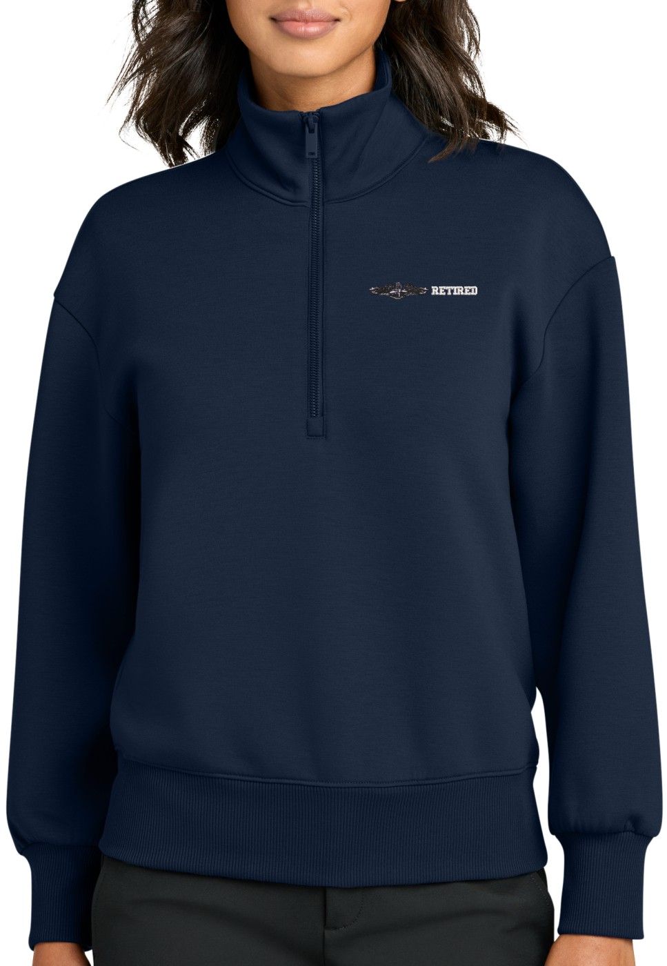 MilitaryBest is proud to offer this U.S. Navy Enlisted Silver Dolphins Retired Women's Soft Spacer Quarter-Zip. This quarter-zip is embroidered by our MilitaryBest team in Northeast Alabama. These quarter-zips are made using spacer yarn to provide light insulation with a soft structure, they also fight odor and provide light UV ray protection.Care Instructions: Turn Garment Inside Out. Machine Wash Cold With Like Colors. Only Non-Chlorine Bleach, When Needed. Tumble Dry Low, Remove Promptly. Cool Iron, If Necessary. Do Not Use Fabric Softeners Or Dryer Sheets.
