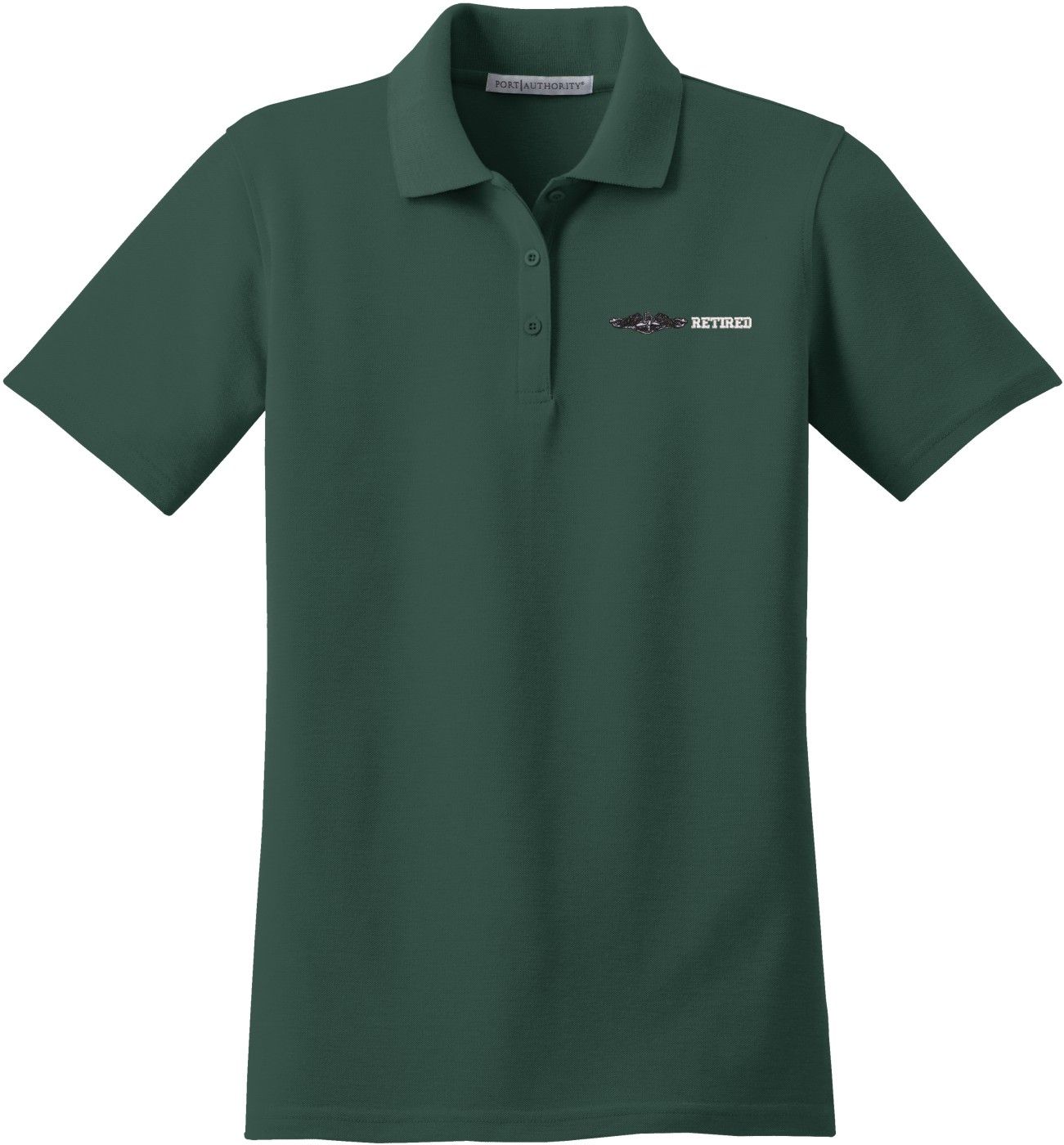MilitaryBest is proud to offer this U.S. Navy Enlisted Silver Dolphins Retired Women's Stain-Release Polo. This polo is embroidered by our MilitaryBest team in Northeast Alabama. These polos are made with a stain-release finish for long-lasting wear, odor-fighting properties, and superior wrinkle and shrink resistance.Care Instructions: Machine Wash Cold With Like Colors. Do Not Use Fabric Softener. Do Not Bleach. Tumble Dry Low. Warm Iron If Necessary.