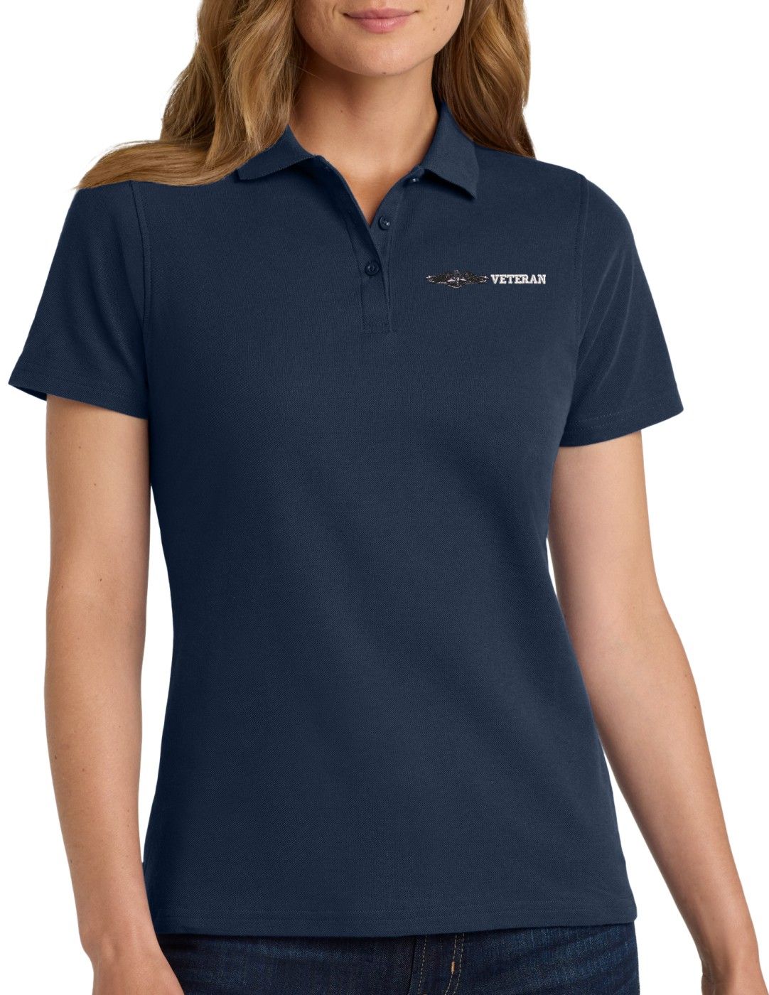 MilitaryBest is proud to offer this U.S. Navy Enlisted Silver Dolphins Veteran Women's Stain-Release Polo. This polo is embroidered by our MilitaryBest team in Northeast Alabama. These polos are made with a stain-release finish for long-lasting wear, odor-fighting properties, and superior wrinkle and shrink resistance.Care Instructions: Machine Wash Cold With Like Colors. Do Not Use Fabric Softener. Do Not Bleach. Tumble Dry Low. Warm Iron If Necessary.