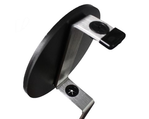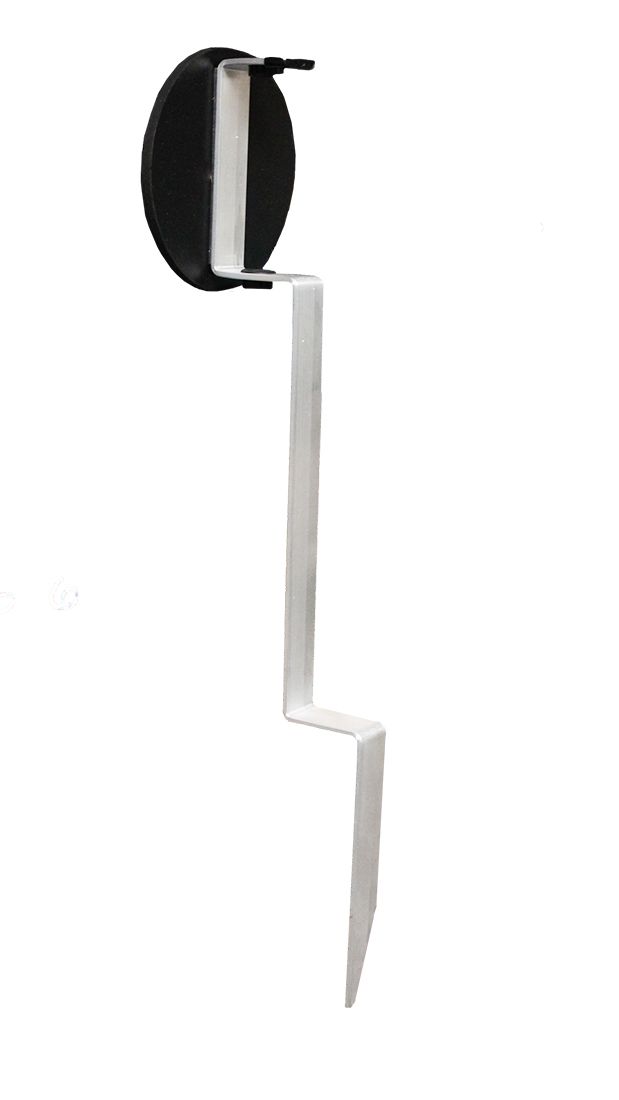 - 5" round disc mounted on a 1x1/8" inch flat aluminum bar that measures 19-1/2" tall.