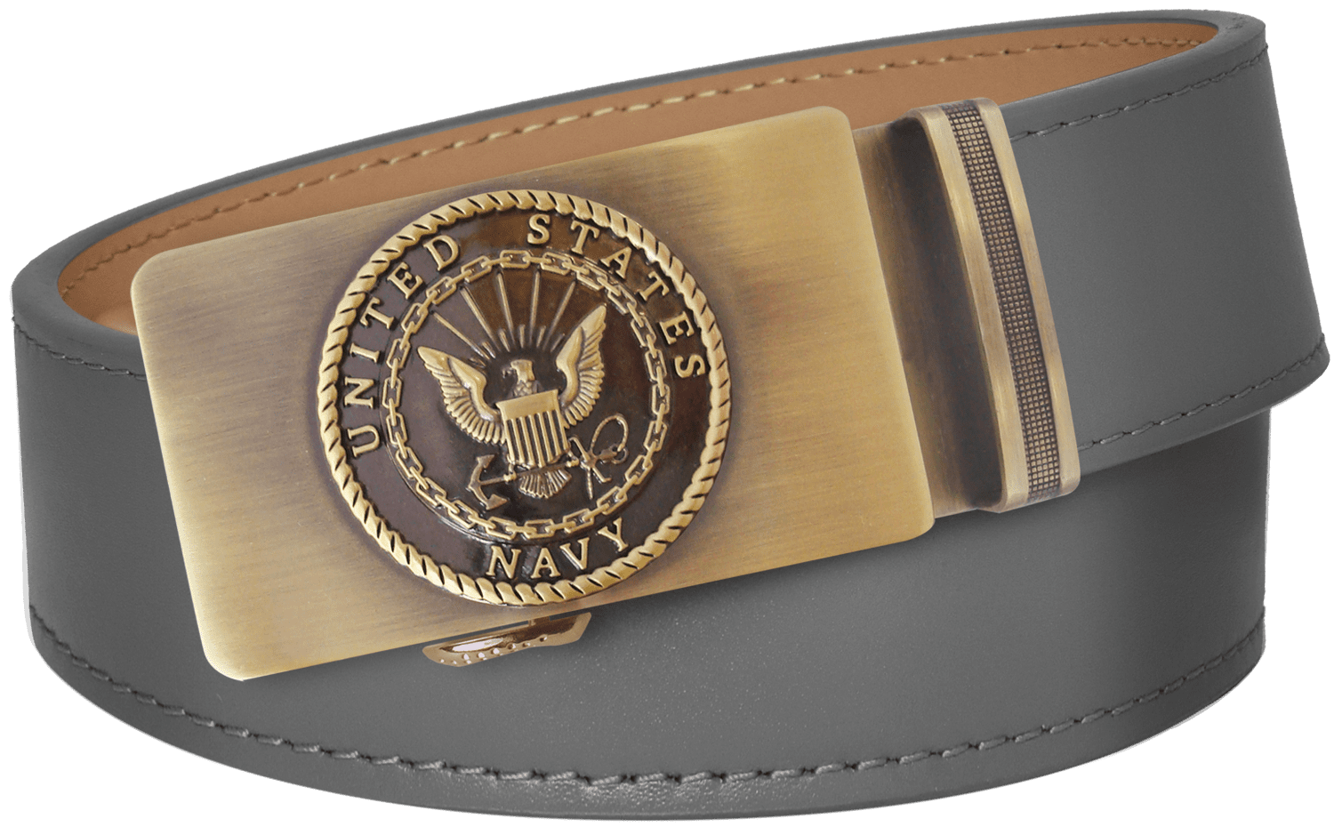 MilitaryBest has partnered with PA Belts to offer this officially Licensed U.S. Navy Grey Full Grain Leather Slide Belt. This wonderfully detailed U.S. Navy Seal belt and buckle is a perfect way to show your pride or to give as a gift to a deserving veteran or active duty service member. This belt and fine Navy Buckle comes in a beautiful 4mm square or round acrylic box with the Official U.S. Navy hologram as your proof of authenticity. One size fits all, simply cut the belt to fit. No more annoying holes, simply slide the belt, listen to the clicks and enhance your fashion. Easy to put on, to wear and to take off. Instructions included.