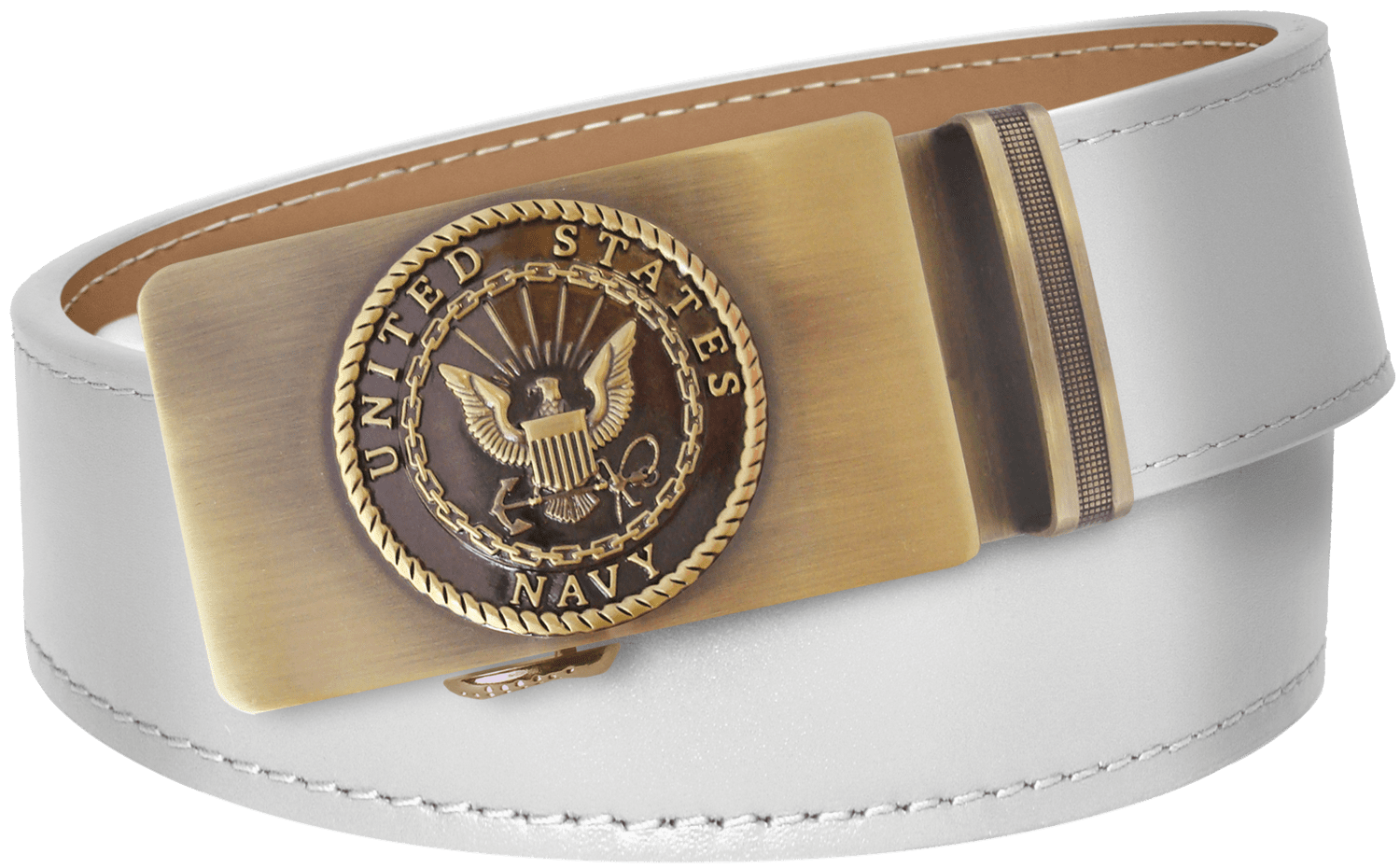 MilitaryBest has partnered with PA Belts to offer this officially Licensed U.S. Navy White Full Grain Leather Slide Belt. This wonderfully detailed U.S. Navy Seal belt and buckle is a perfect way to show your pride or to give as a gift to a deserving veteran or active duty service member. This belt and fine Navy Buckle comes in a beautiful 4mm square or round acrylic box with the Official U.S. Navy hologram as your proof of authenticity. One size fits all, simply cut the belt to fit. No more annoying holes, simply slide the belt, listen to the clicks and enhance your fashion. Easy to put on, to wear and to take off. Instructions included.