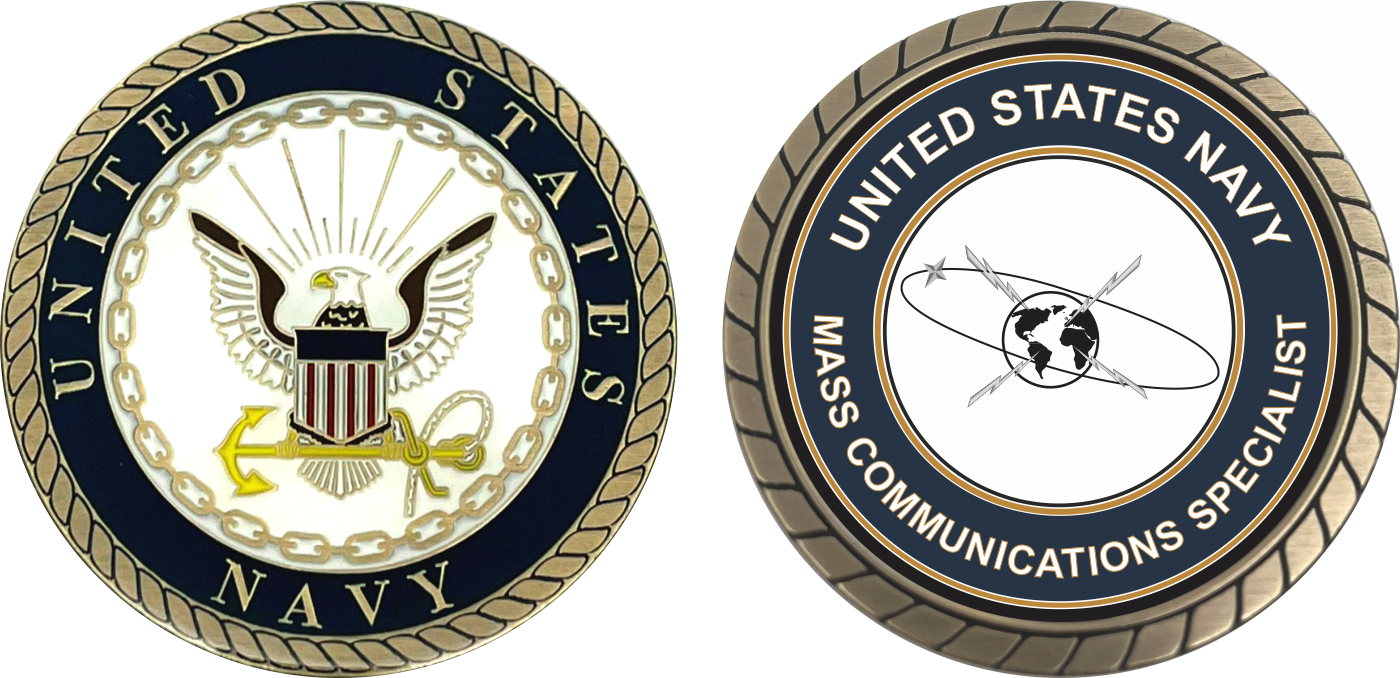 This 1 3/4” U.S. Navy Mass Communications Specialist MC Challenge Coin is proudly offered by MilitaryBest. This Officially Licensed Navy coin has beautiful enamel finish on one side and an organized crisp clean Mass Communications Specialist MC design on the opposite side.