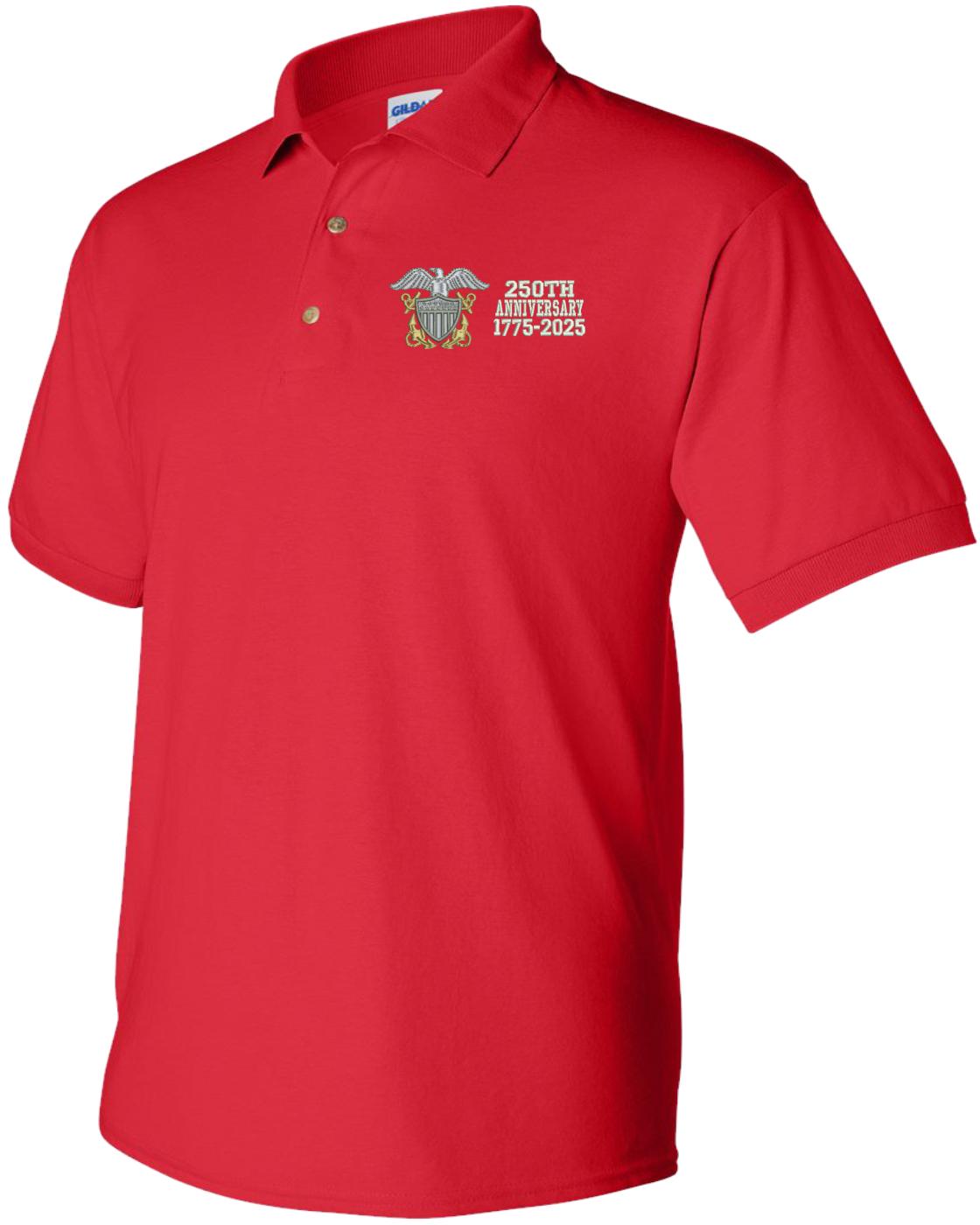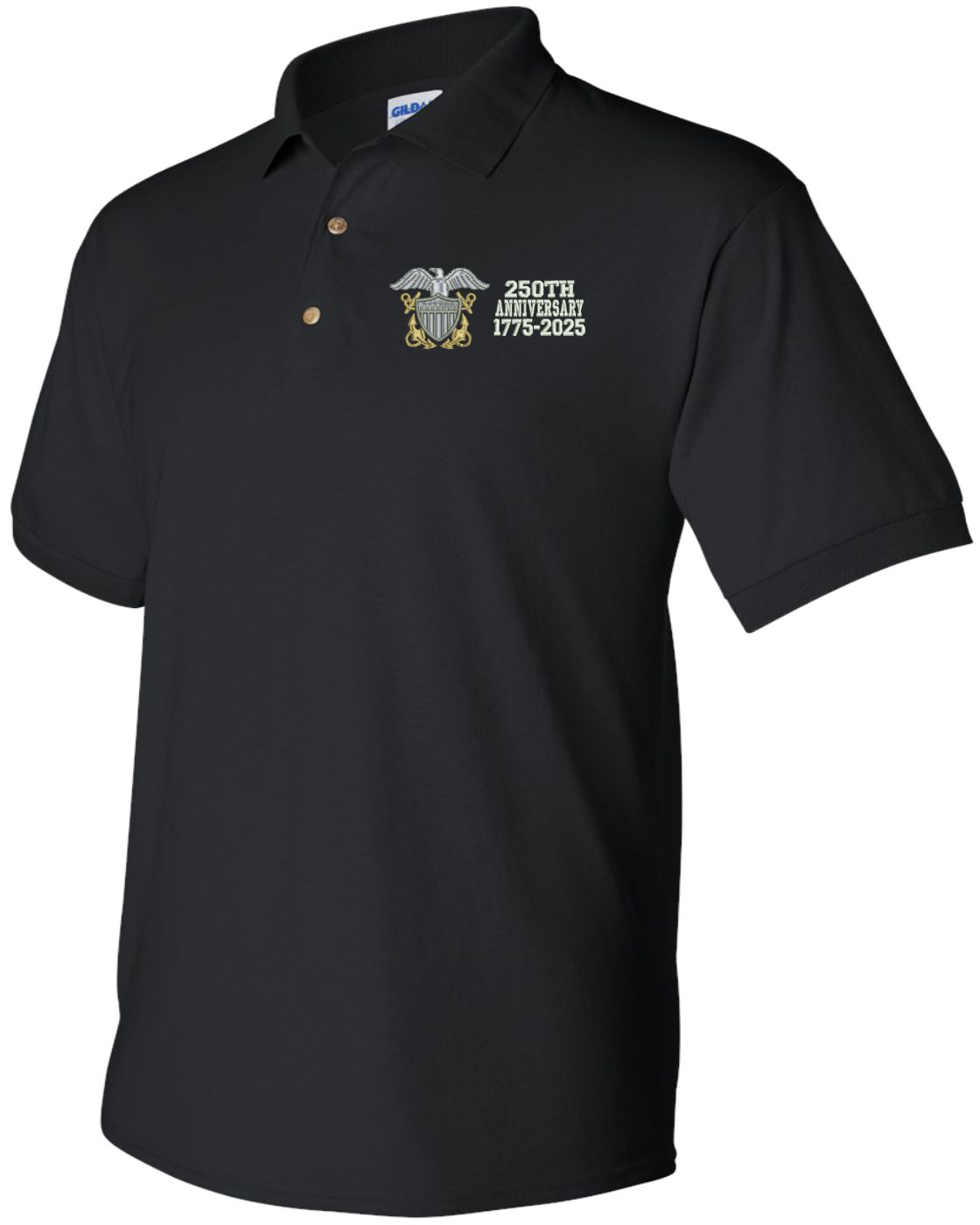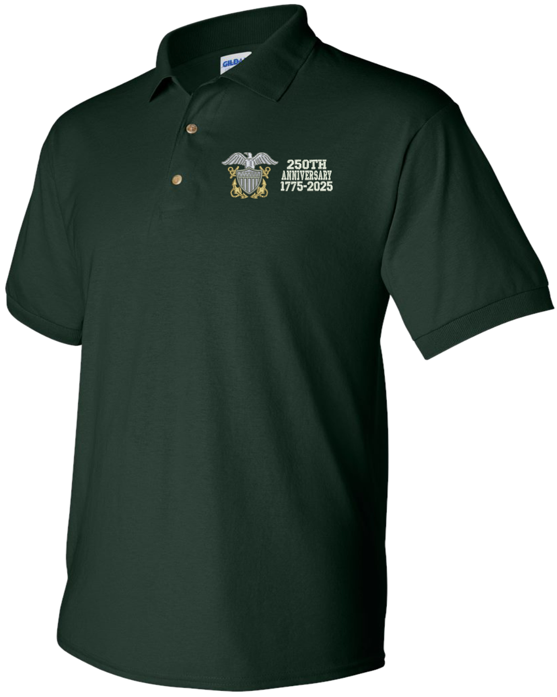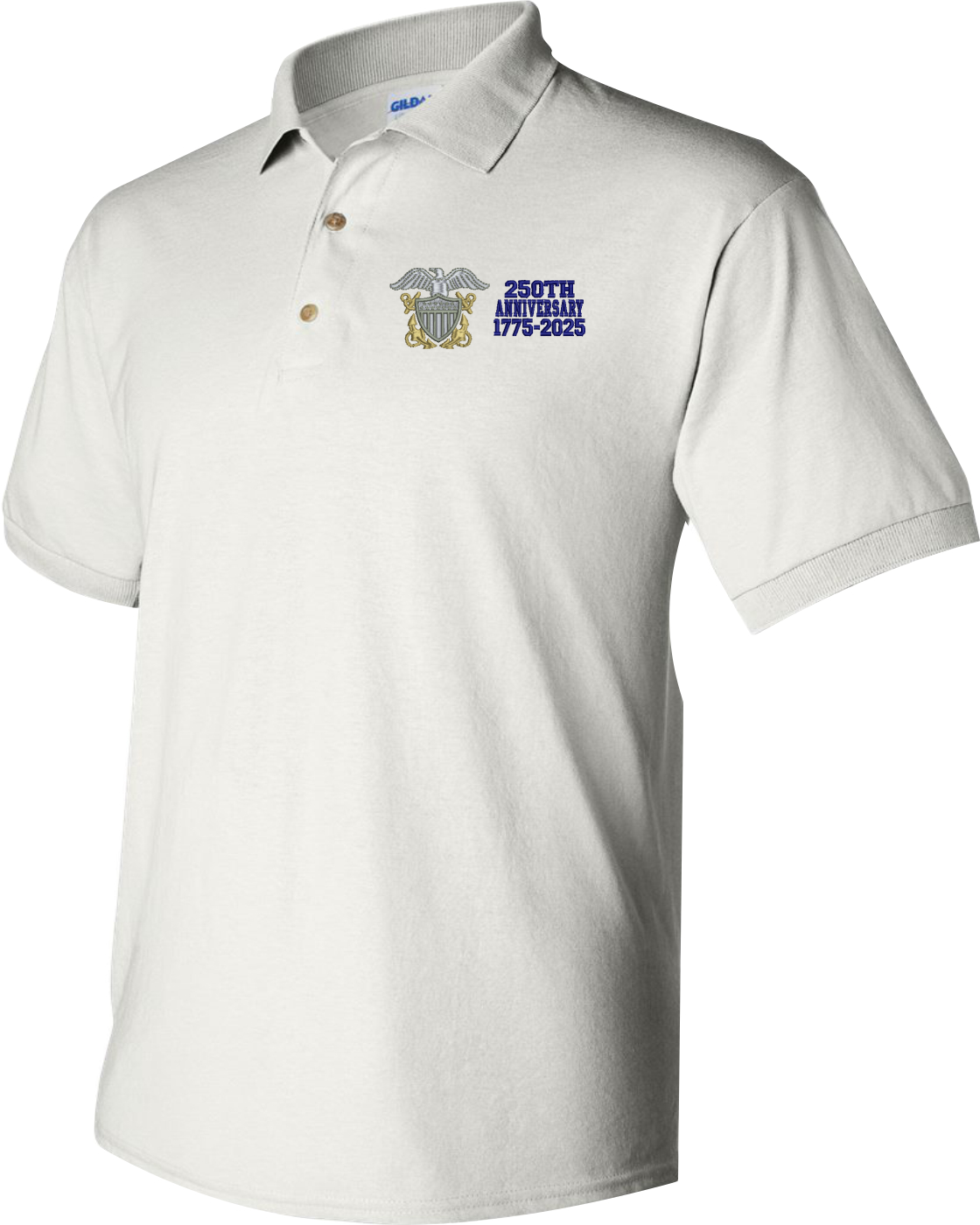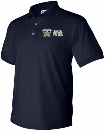MilitaryBest is proud to offer this quality U.S. Navy Officer 250th Anniversary Split Design Embroidered Polo. Each Polo is available in either 100% Ringspun cotton pique or a 50/50 cotton/polyester blend. These quality Military Polos are proudly embroidered at our facilities in Scottsboro, AL. Support the Army MWR program by purchasing only from Licensed Vendors.