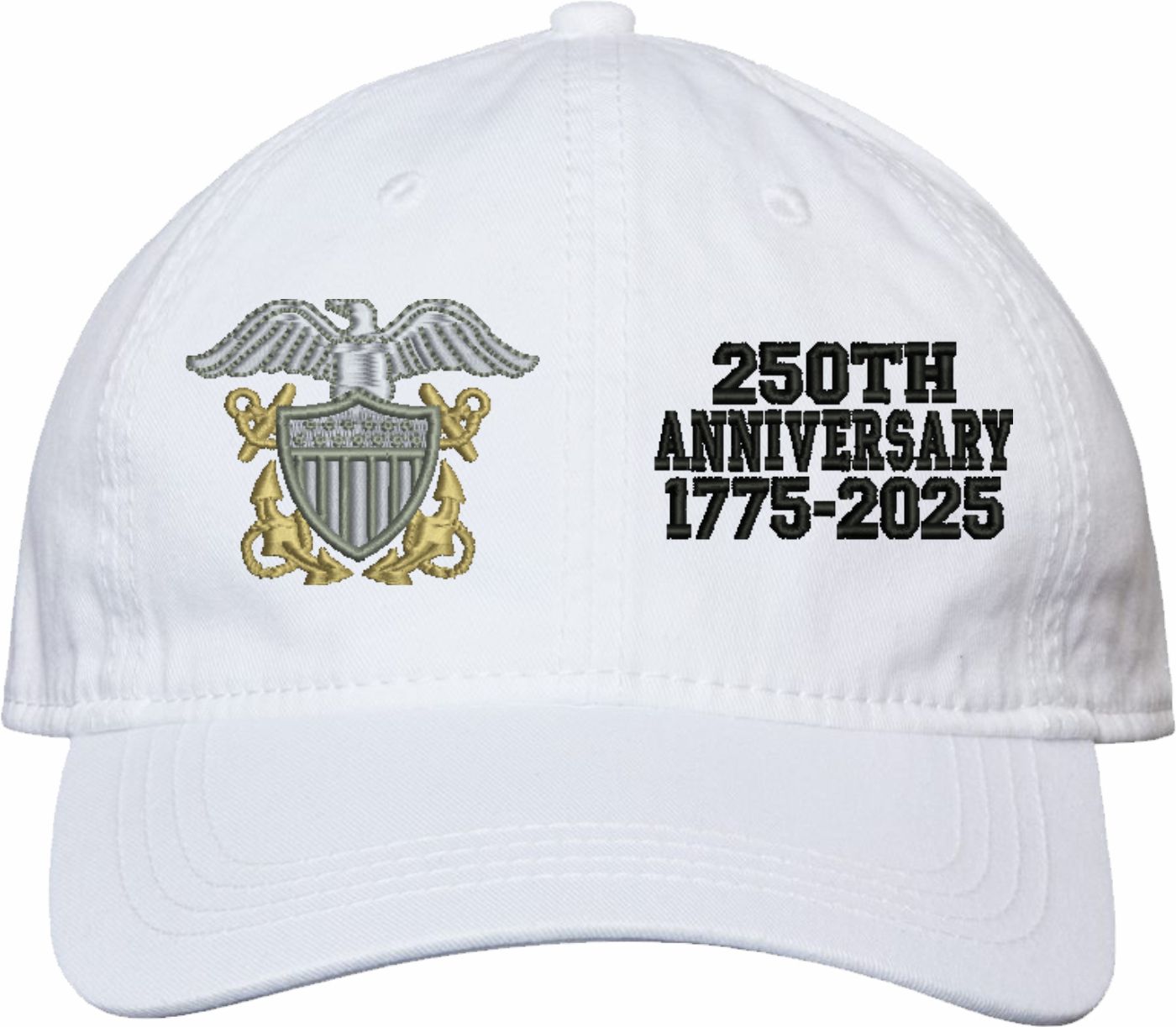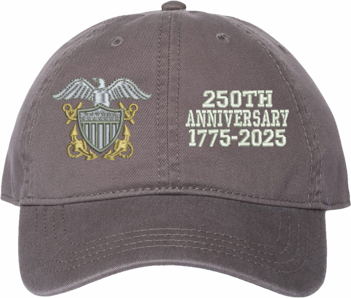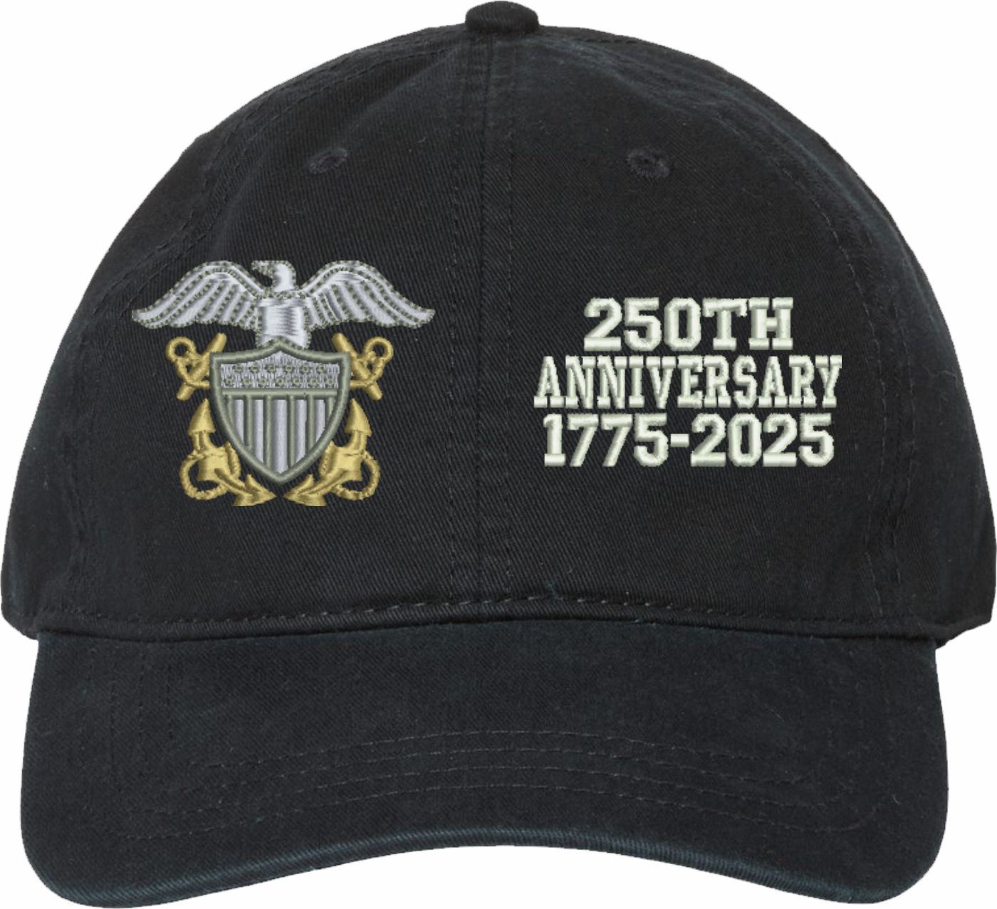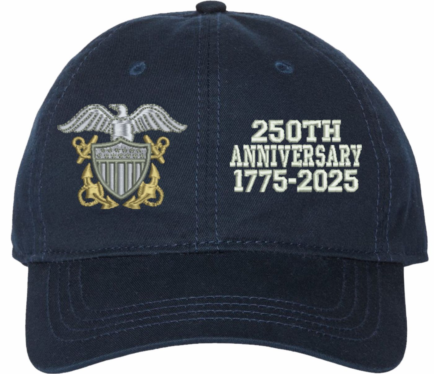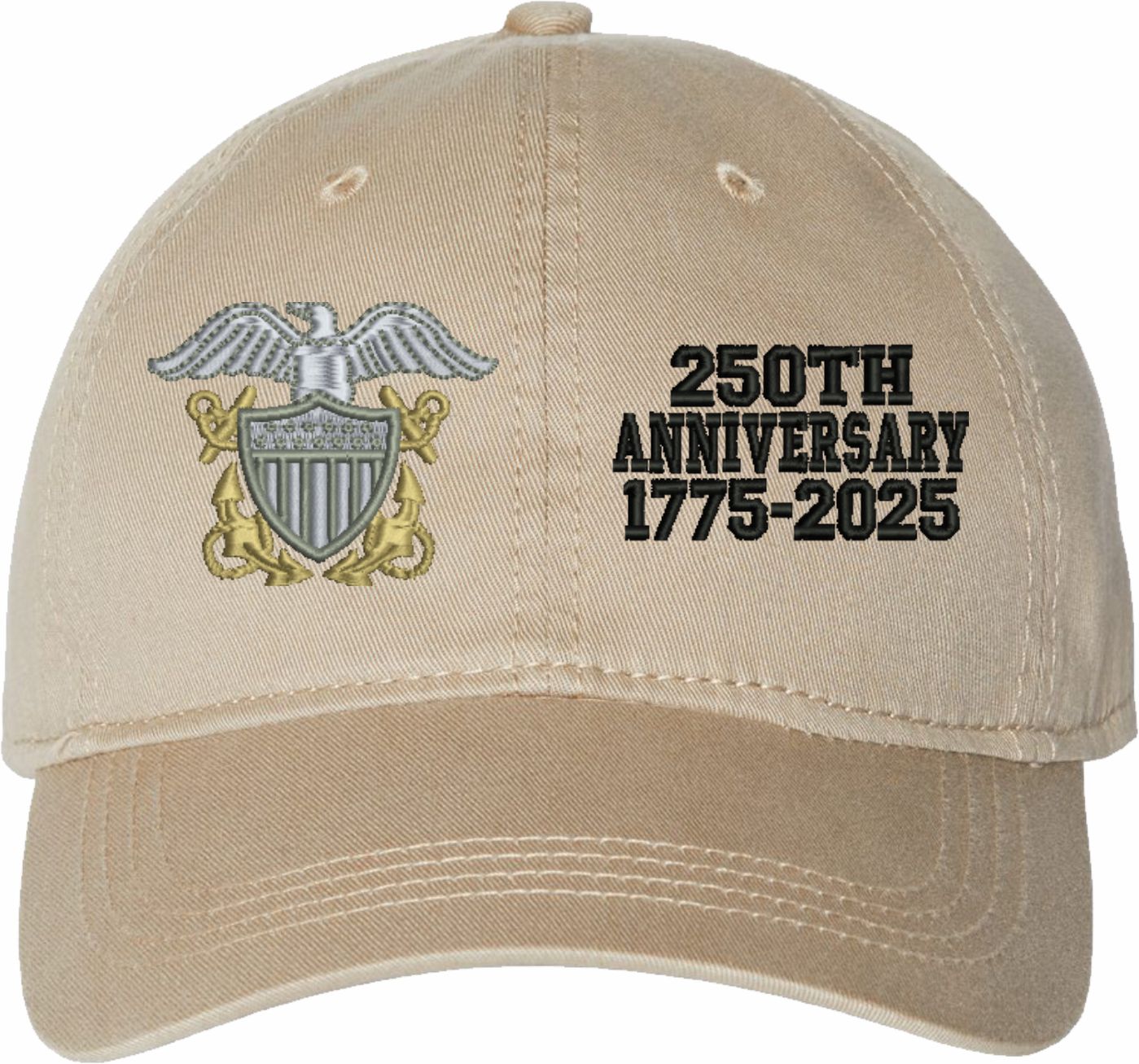Show your Navy pride with this U.S. Navy Officer 250th Anniversary Split Design Unstructured Dad Cap from MilitaryBest. Crafted from 100% washed chino twill cotton, this six-panel, low-profile cap offers a relaxed and comfortable fit. Featuring high-quality embroidery done in our Scottsboro, Alabama facility, this cap is designed with a pre-curved visor and an adjustable tri-glide buckle closure for a perfect fit. Whether for everyday wear or as a meaningful gift, this cap is a great way to honor your own or a loved one's service.If a ribbon stack is chosen as the insignia, side of insignia text can not be embroidered. For caps ordered with custom embroidered personalized text please allow an additional 3 to 5 days production time. All custom back text will be embroidered in ALL CAPITAL LETTERS. Caps with back text or eggs are non-returnable unless there is a material defect in the cap.