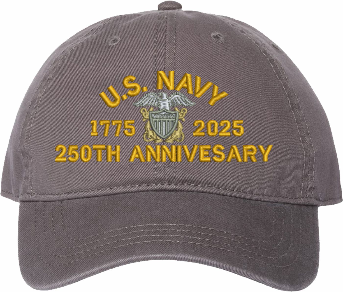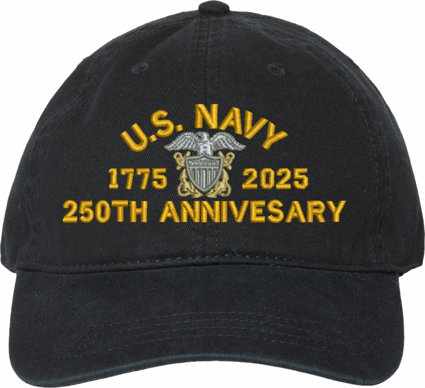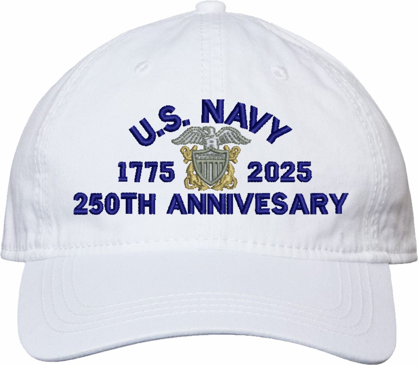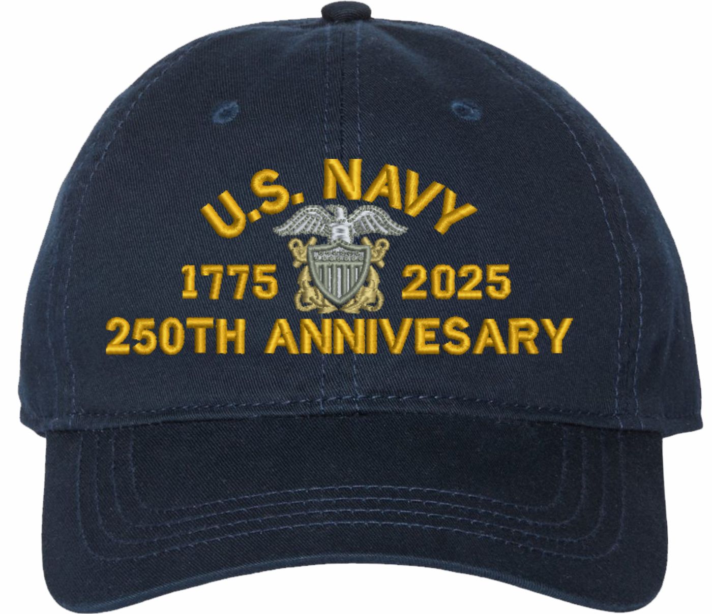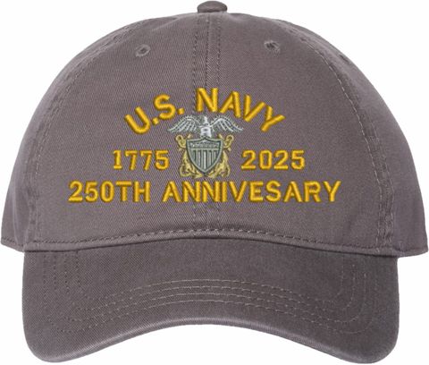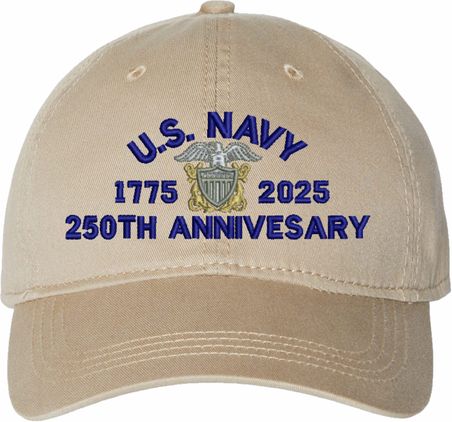 Show your Navy pride with this U.S. Navy Officer 250th Anniversary Unstructured Dad Cap from MilitaryBest. Crafted from 100% washed chino twill cotton, this six-panel, low-profile cap offers a relaxed and comfortable fit. Featuring high-quality embroidery done in our Scottsboro, Alabama facility, this cap is designed with a pre-curved visor and an adjustable tri-glide buckle closure for a perfect fit. Whether for everyday wear or as a meaningful gift, this cap is a great way to honor your own or a loved one's service.If a ribbon stack is chosen as the insignia, side of insignia text can not be embroidered. For caps ordered with custom embroidered personalized text please allow an additional 3 to 5 days production time. All custom back text will be embroidered in ALL CAPITAL LETTERS. Caps with back text or eggs are non-returnable unless there is a material defect in the cap.