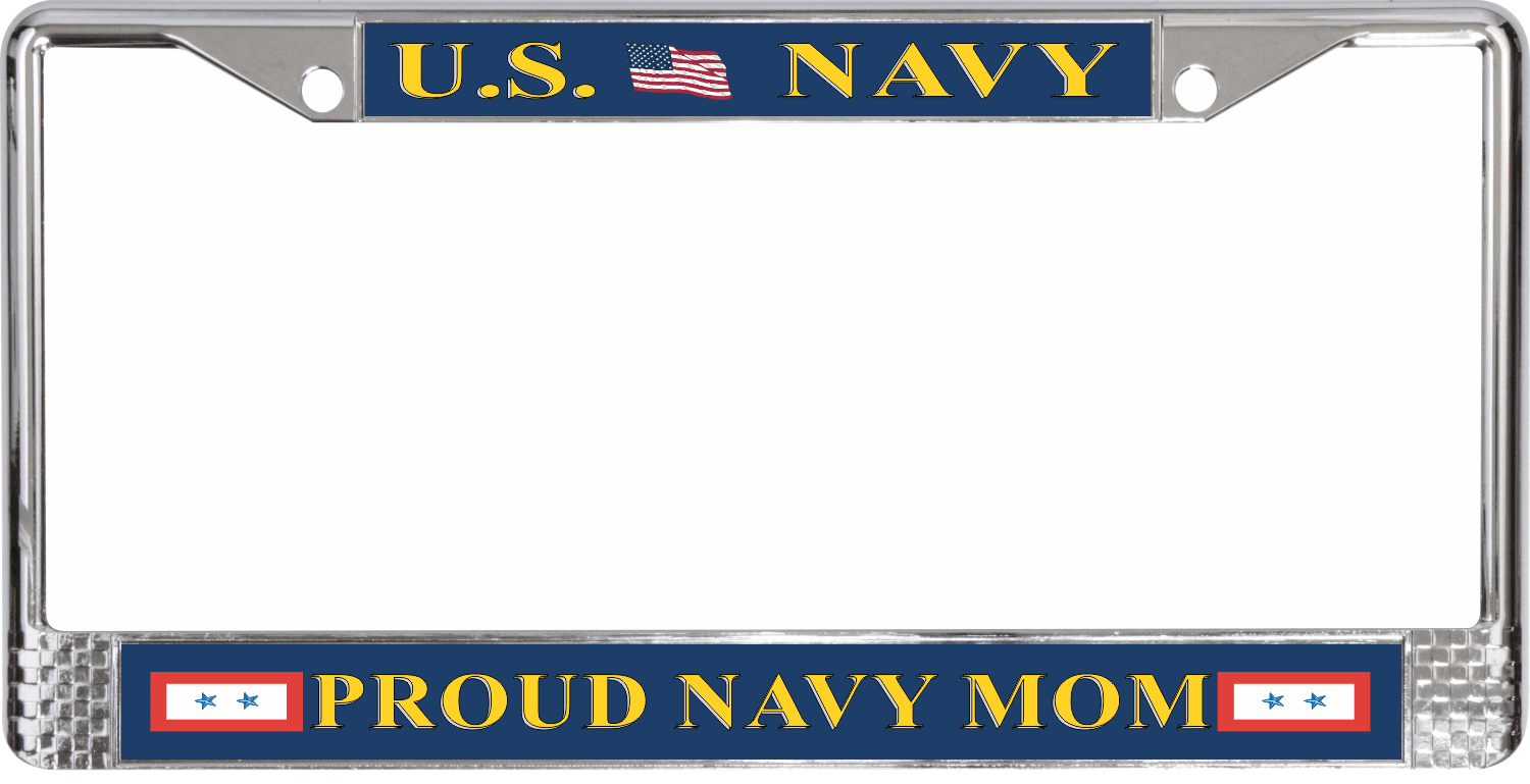 U.S. Navy Proud Navy Mom License Plate FrameThis U.S. Navy Proud Navy Mom License Plate Frame is made from the highest quality finished metal alloy. Each one is designed to provide years of use. Each is designed in our facility in Scottsboro, Alabama.