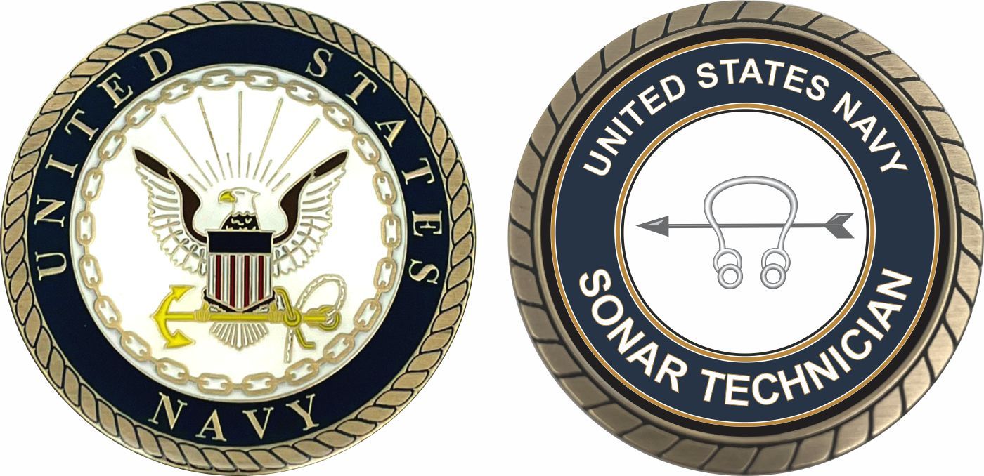 This 1 3/4” U.S. Navy Sonar Technician ST Challenge Coin is proudly offered by MilitaryBest. This Officially Licensed Navy coin has beautiful enamel finish on one side and an organized crisp clean Sonar Technician ST design on the opposite side.