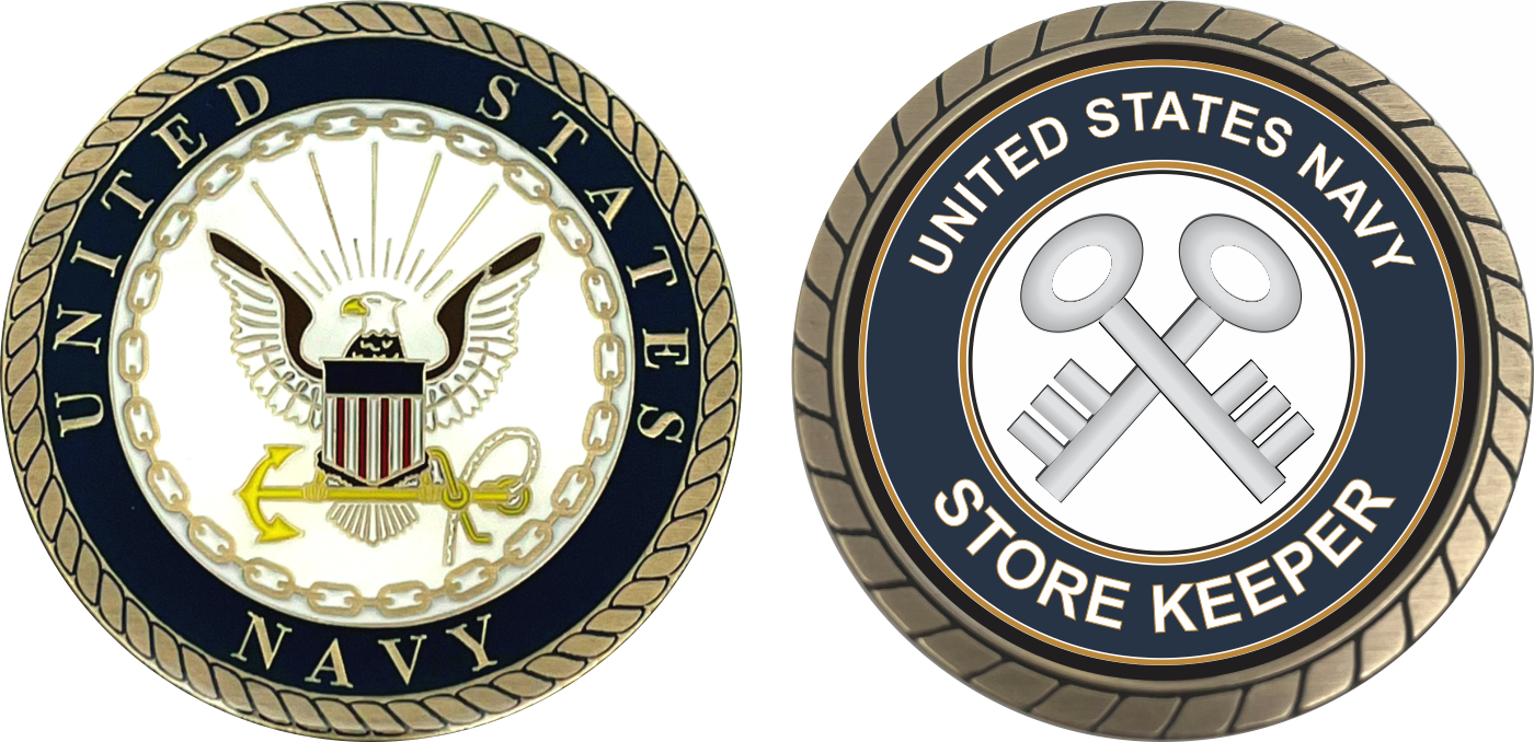 This 1 3/4” U.S. Navy Storekeeper SK Challenge Coin is proudly offered by MilitaryBest. This Officially Licensed Navy coin has beautiful enamel finish on one side and an organized crisp clean Storekeeper SK design on the opposite side.