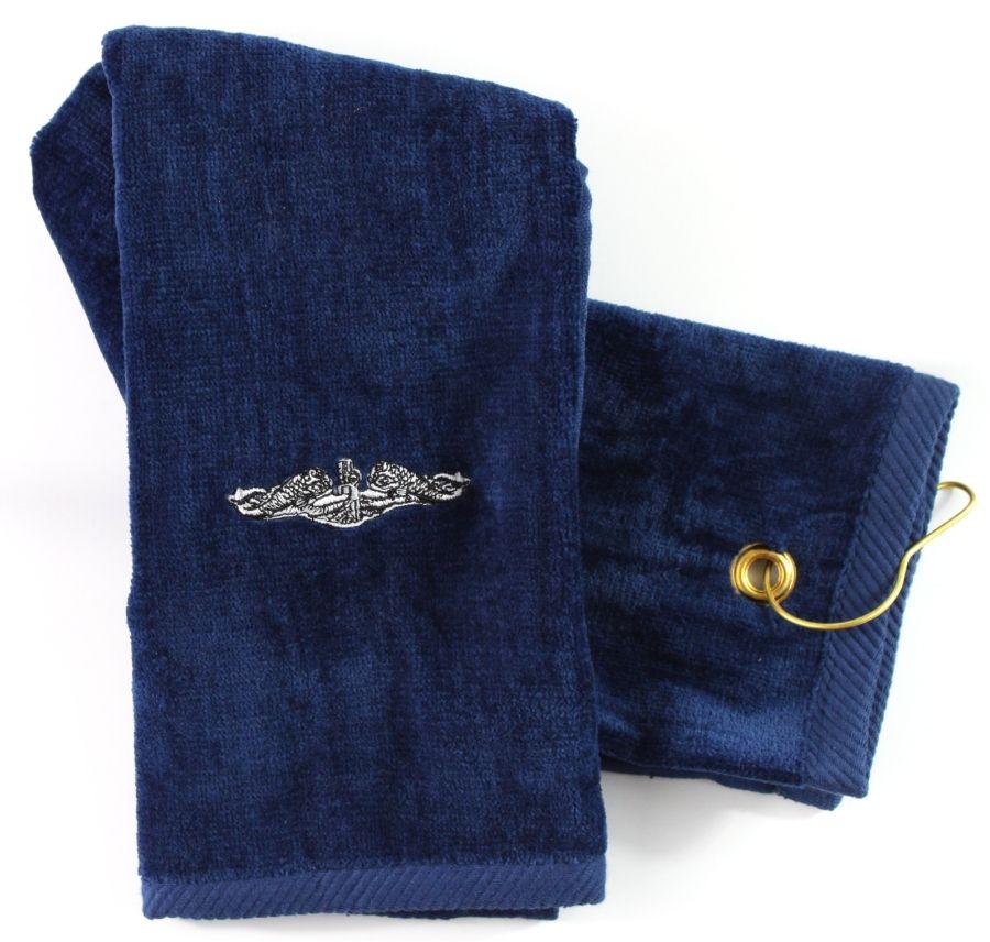 Our custom embroidered Tri-Fold golf towels by Royal Comfort are made from 100% cotton velour. We embroider each golf towel to order with your choice of service dolphins at our facilities in Scottsboro, AL.