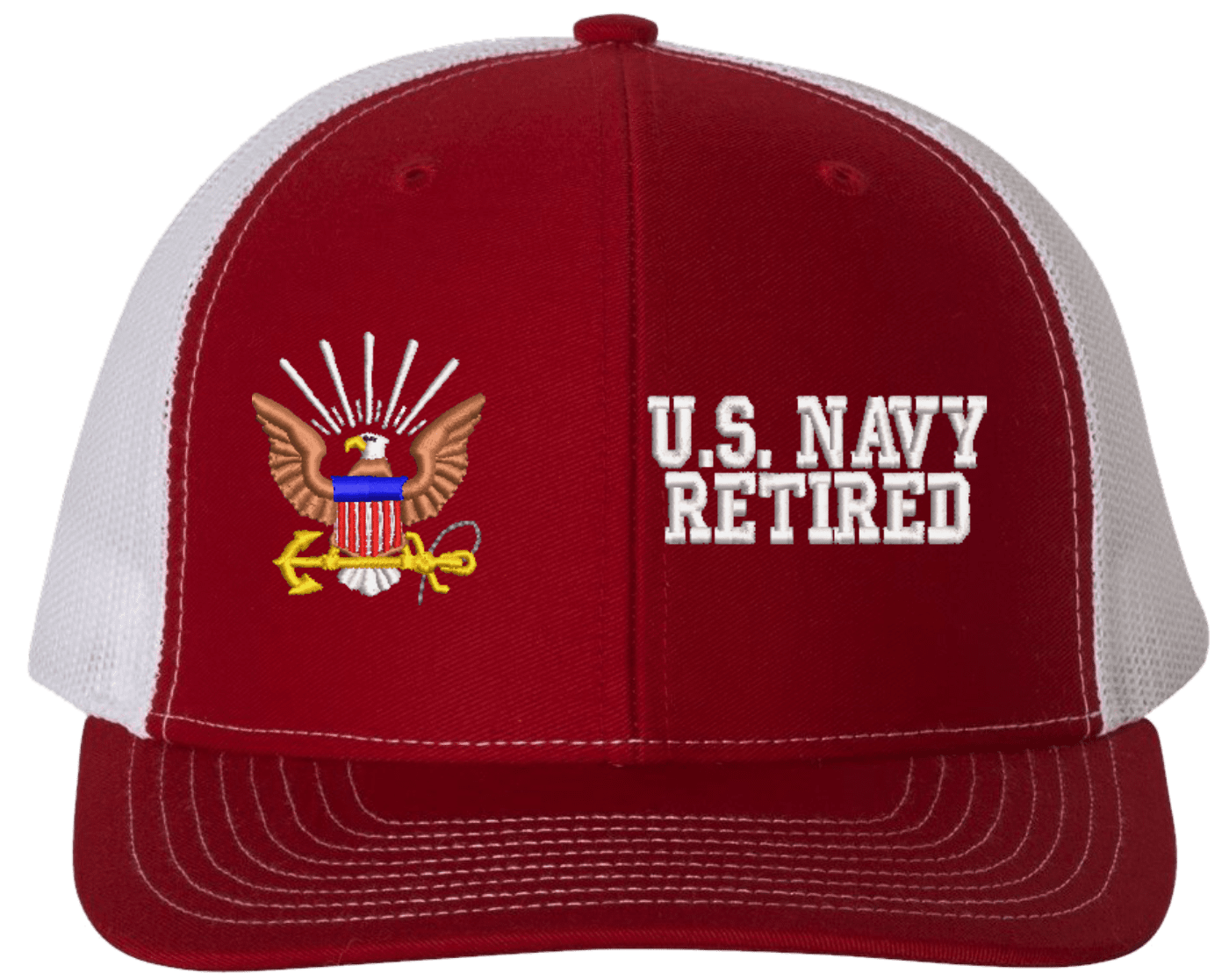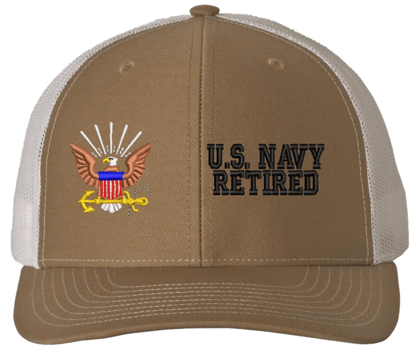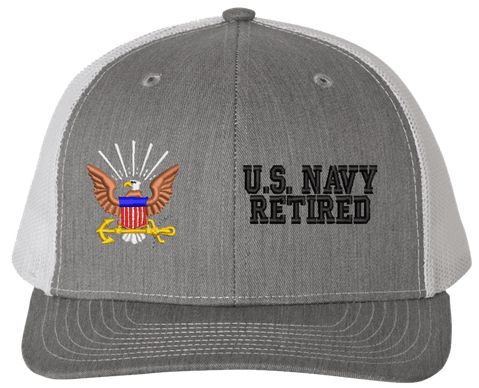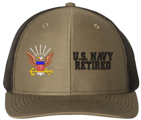 MilitaryBest is proud to offer this U.S. Navy Retired Mesh Back Cap. The design of this U.S. Navy Cap is crisp, clean, and sure to be loved by people of all ages! Select above from our many cap colors. This U.S. Navy Retired Mesh Back Cap is crafted by our skilled embroidery technicians at our facilities in Scottsboro, AL. As with all MilitaryBest items, your satisfaction is guaranteed!Caps ordered with custom embroidered personalized back text require an additional 2 to 3 days production time. All custom back text will be embroidered in ALL CAPITAL LETTERS. Caps personalized with back text are non-returnable unless there is a material defect in the cap.