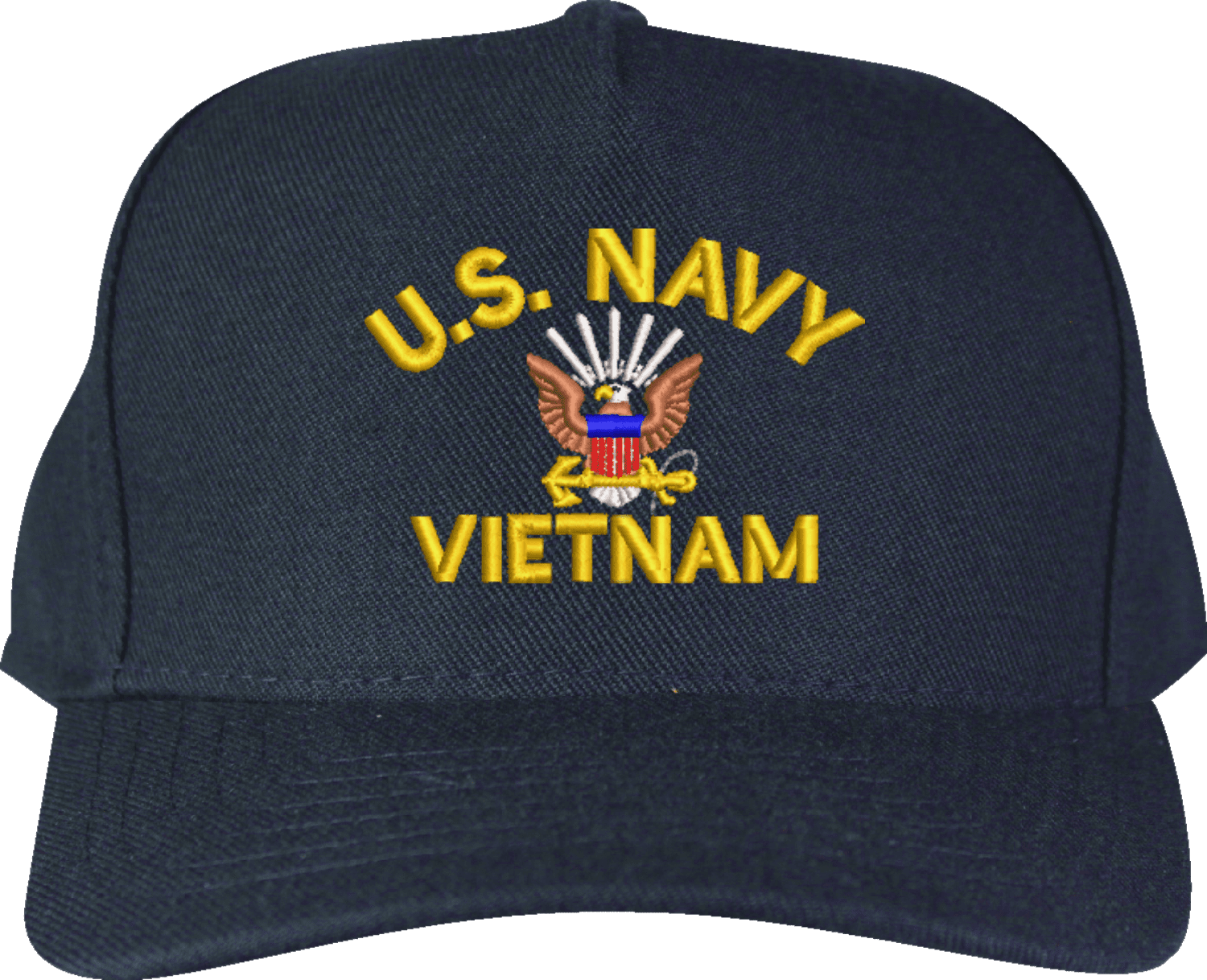 MilitaryBest is proud to offer this quality U.S. Navy Vietnam Embroidered Cap. This cap is available in either 5 panel high profile or 6 panel low profile styling. This U.S. Navy Vietnam Embroidered Cap will make a great addition to your collection or a great gift. You are sure to be the envy of all your veteran buddies. This U.S. Navy Vietnam Embroidered Cap is embroidered at our facilities in Scottsboro, AL by skilled craftsmen with a passion for patriotism. Your satisfaction is guaranteed!We will be glad to include scrambled eggs. For caps ordered with custom embroidered personalized text please allow an additional 3 to 5 days production time. All custom back text will be embroidered in ALL CAPS. Caps with back text or eggs are non-returnable unless there is a material defect in the cap. Unless specified otherwise text will be embroidered with traditional yellow/gold thread.
