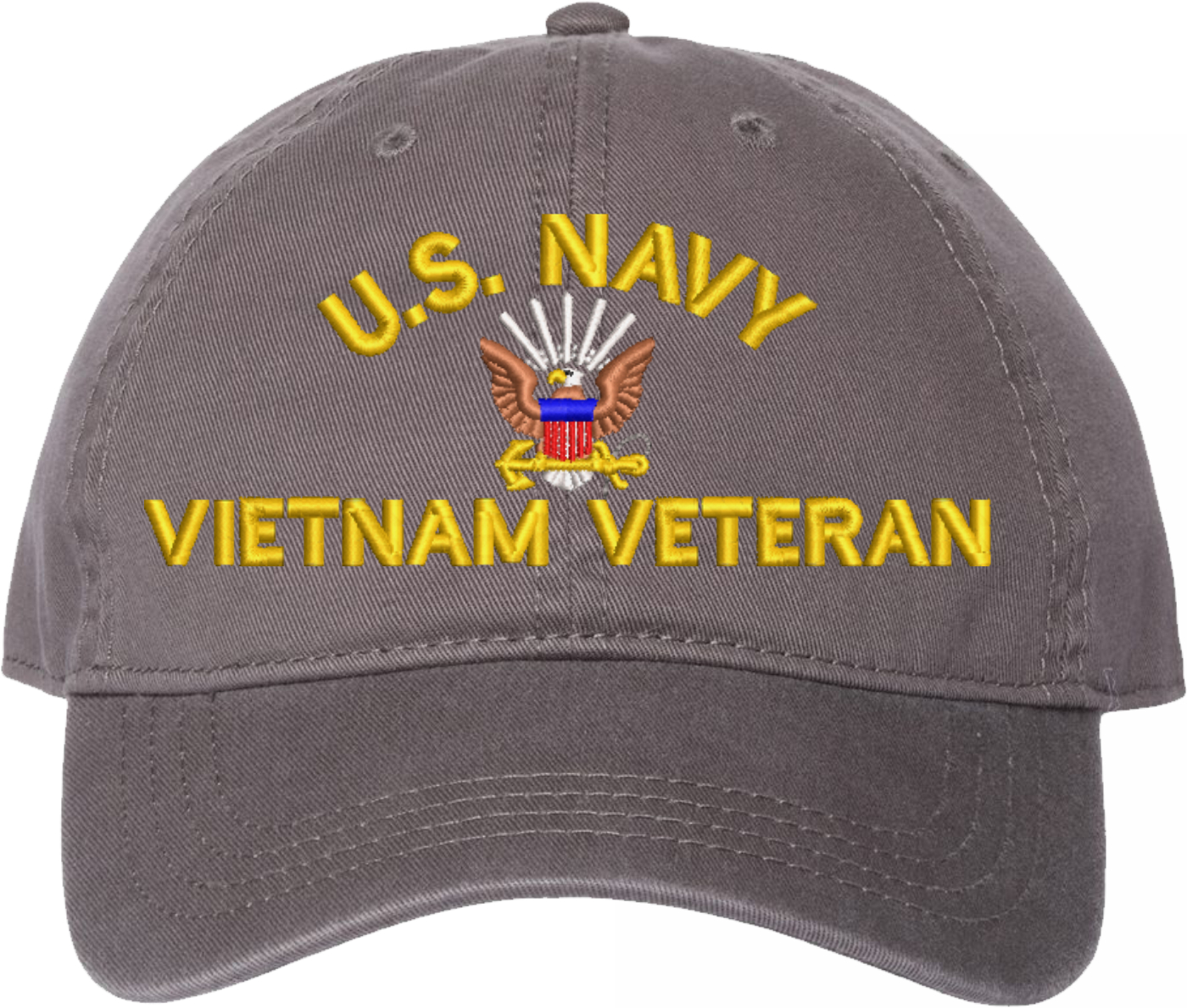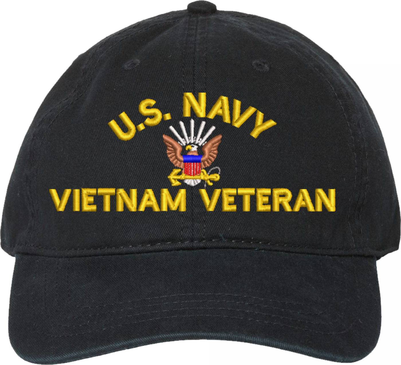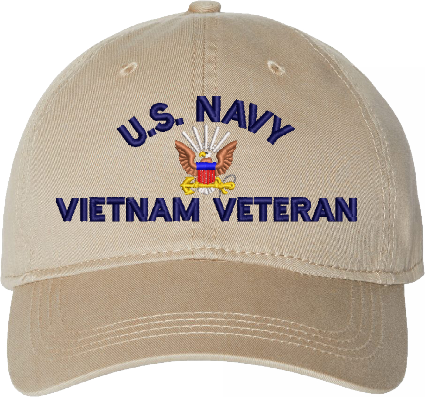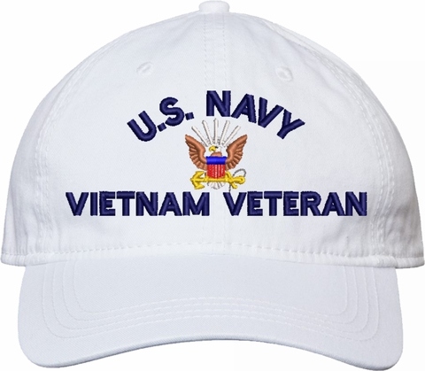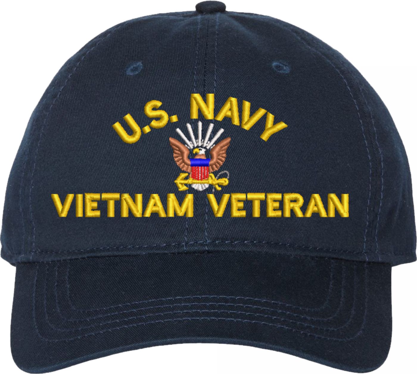 Show your Navy pride with this U.S. Navy Vietnam Veteran Unstructured Dad Cap from MilitaryBest. Also known as an "Old Salt" Cap, This hat was crafted from 100% washed chino twill cotton, this six-panel, low-profile cap offers a relaxed and comfortable fit. Featuring high-quality embroidery done in our Scottsboro, Alabama facility, this cap is designed with a pre-curved visor and an adjustable tri-glide buckle closure for a perfect fit. Whether for everyday wear or as a meaningful gift, this cap is a great way to honor your own or a loved one's service.For caps ordered with custom embroidered personalized text please allow an additional 3 to 5 days production time. All custom back text will be embroidered in ALL CAPITAL LETTERS. Caps with back text or eggs are non-returnable unless there is a material defect in the cap.