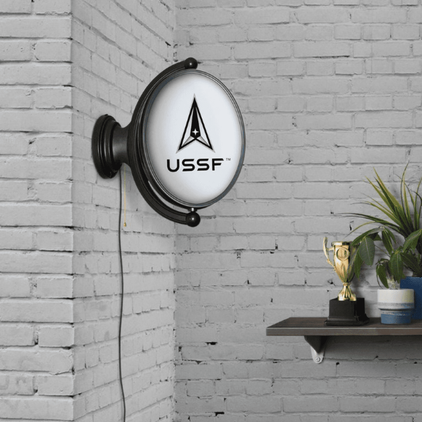 The Original United States Space Force Rotating Lighted Wall Sign both lights up and spins while featuring the Space Force logo. Whether it's your fan cave, office, game room, or garage, this decorative sign is the perfect addition to any wall. It showcases the latest in LED technology and only uses 12 watts of power. Injection molded, it comes with an 8ft. power cord and a metal pull chain. Mounting hardware included and installation takes no more than 10 minutes. This is an officially licensed product of the Space Force and made in the USA.FEATURES