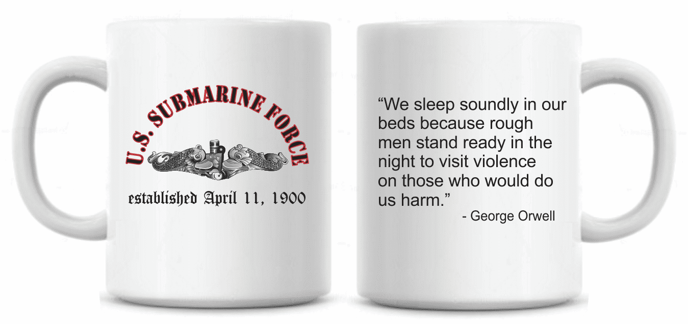 This US Submarine Force/Orwell Ceramic Coffee Mug features a sublimated insignia on the front and reverse side of the mug. Our mugs are not dishwasher safe, they are hand wash only. Each mug’s quality is guaranteed.A percentage of the sale of each MilitaryBest item is forwarded to the licensing departments of each respective branch of service in support of the MWR (Morale, Welfare, & Recreation) program. These payments are made by either ALL4U LLC or the wholesaler from where the item originated. Our team thanks you for your service and your support of these programs.