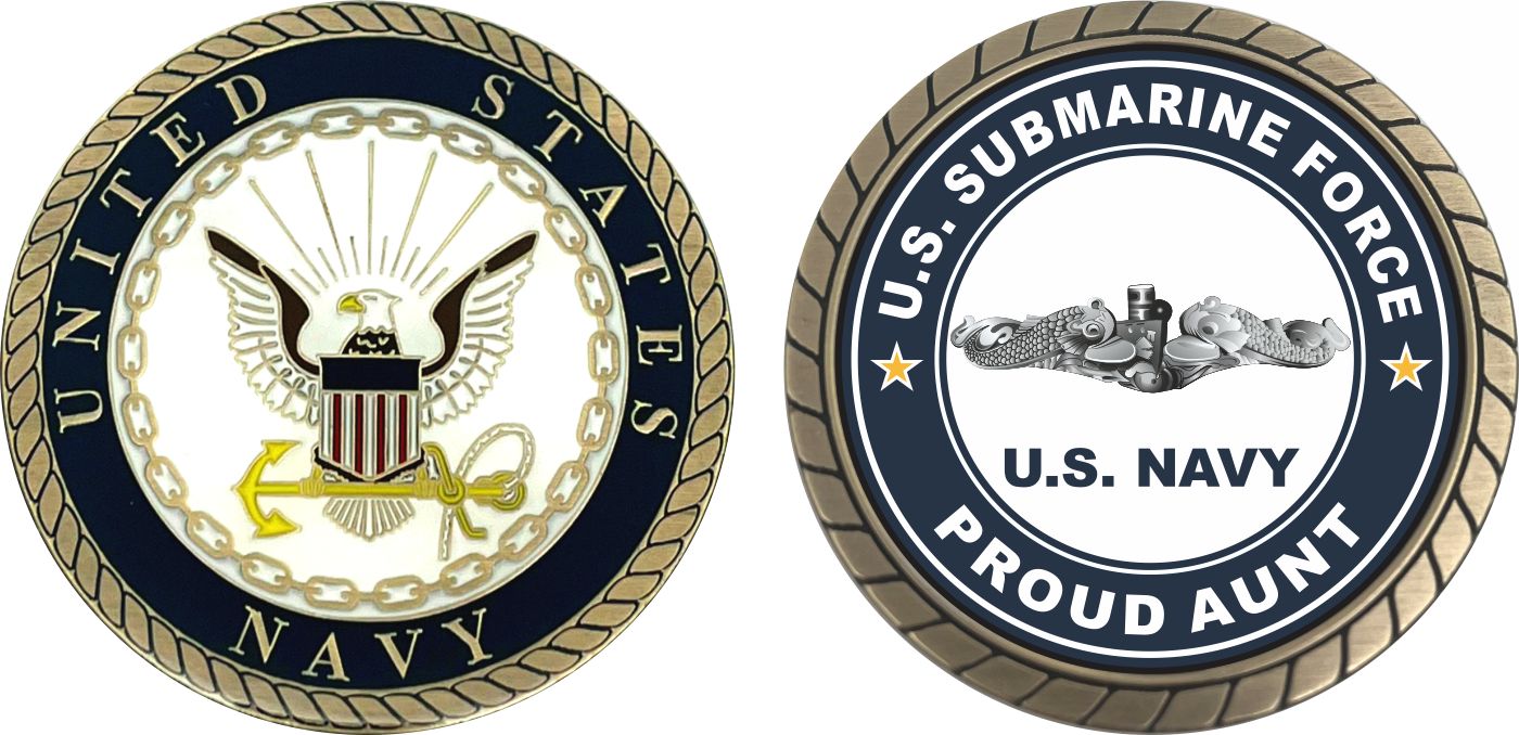 This 1 3/4” US Submarine Force Proud Aunt Silver Dolphins Challenge Coin is proudly offered by MilitaryBest. This Officially Licensed Navy coin has beautiful enamel finish on one side and an organized crisp clean US Submarine Force Proud Aunt design on the opposite side.