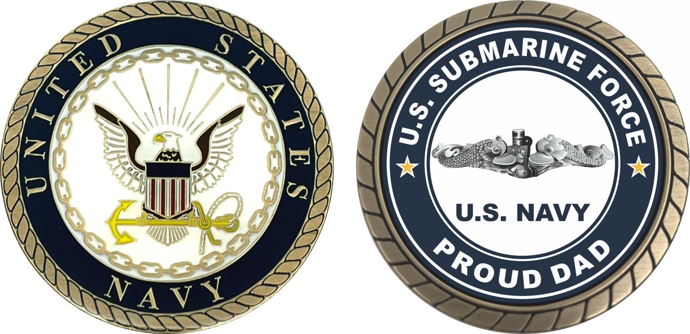 This 1 3/4” US Submarine Force Proud Dad Silver Dolphins Challenge Coin is proudly offered by MilitaryBest. This Officially Licensed Navy coin has beautiful enamel finish on one side and an organized crisp clean US Submarine Force Proud Dad design on the opposite side.