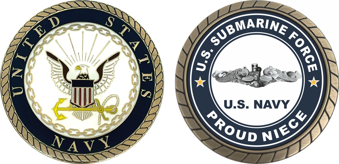 This 1 3/4” US Submarine Force Proud Niece Silver Dolphins Challenge Coin is proudly offered by MilitaryBest. This Officially Licensed Navy coin has beautiful enamel finish on one side and an organized crisp clean US Submarine Force Proud Niece design on the opposite side.