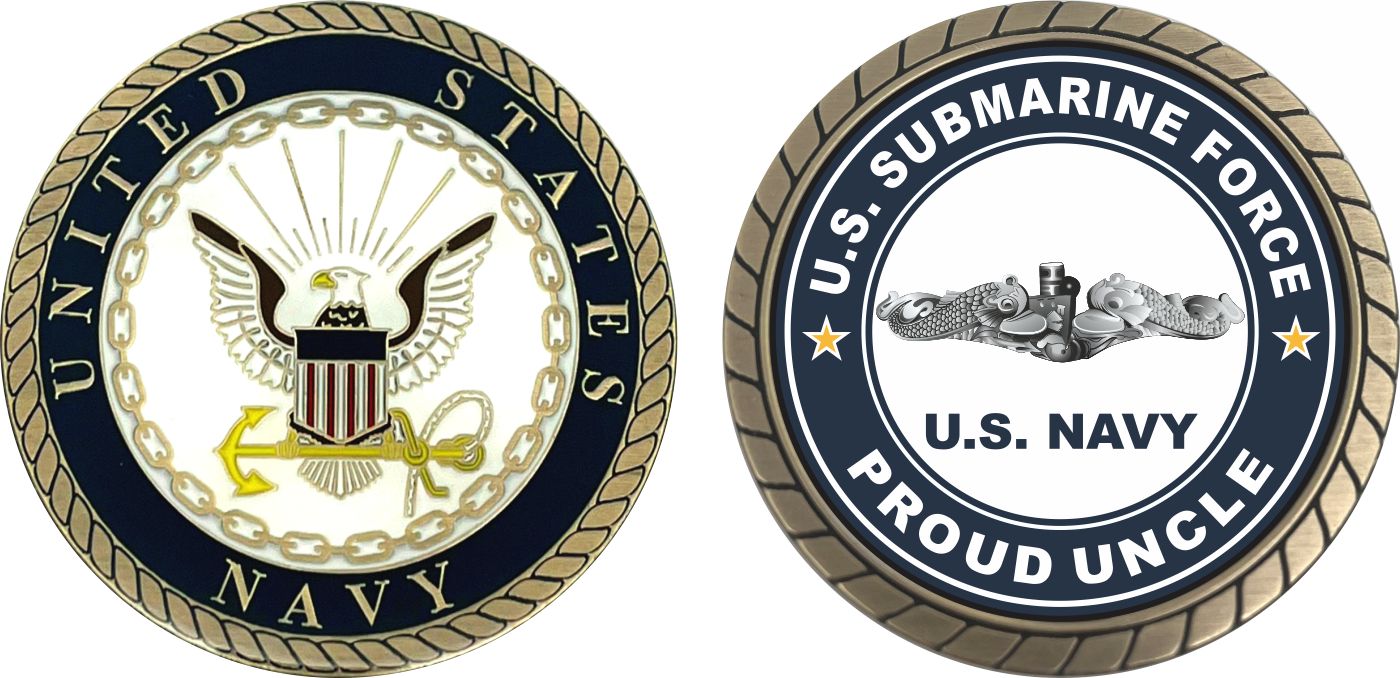 This 1 3/4” US Submarine Force Pround Uncle Silver Dolphins Challenge Coin is proudly offered by MilitaryBest. This Officially Licensed Navy coin has beautiful enamel finish on one side and an organized crisp clean US Submarine Force Pround Uncle design on the opposite side.