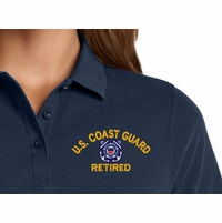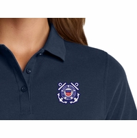 MilitaryBest is proud to offer this U.S. Coast Guard Custom Women's Stain-Release Polo. This polo is embroidered by our MilitaryBest team in Northeast Alabama. These polos are made with a stain-release finish for long-lasting wear, odor-fighting properties, and superior wrinkle and shrink resistance.