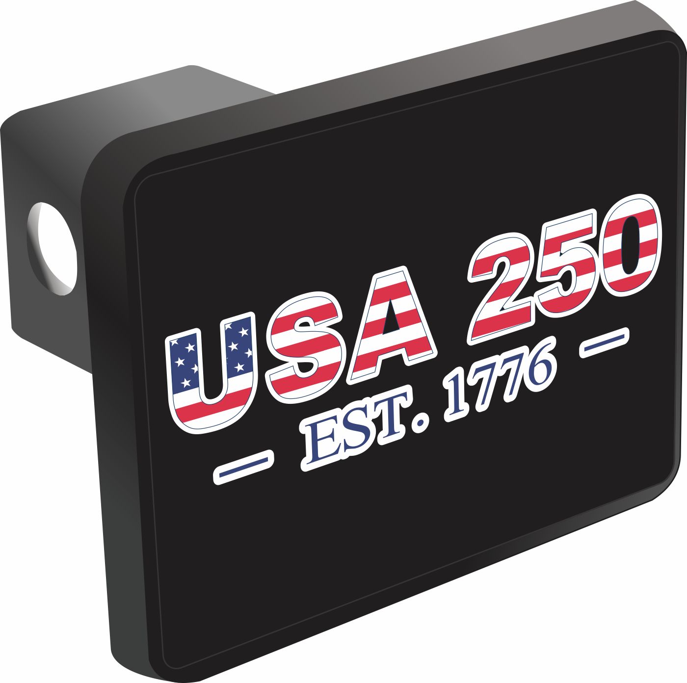 This USA 250 Est 1776 Hitch Cover is proudly Made in the USA. Each Hitch Cover's face plate measures 4.7" x 3.4" and is applied on a black heavy duty injection molded plastic 2" hitch cover; link pin not included. The face plate of the hitch cover is sublimation printed to provide a beautiful glossy finish sure to catch the eye. This hitch cover would make a wonderful addition to your truck or other vehicle.A percentage of the sale of each MilitaryBest item is forwarded to the licensing departments of each respective branch of service in support of the MWR (Morale, Welfare, & Recreation) program. These payments are made by either ALL4U LLC or the wholesaler from where the item originated. Our team thanks you for your service and your support of these programs.