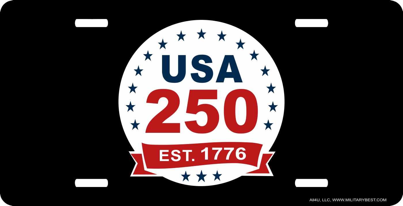 This USA 250 with Banner License Plate is made from heavy gauge aluminum and has a baked enamel finish to last for many years of use. Each plate measures 5 15/16" x 11 15/16". This license plate would make a wonderful addition to your collection or a great gift.