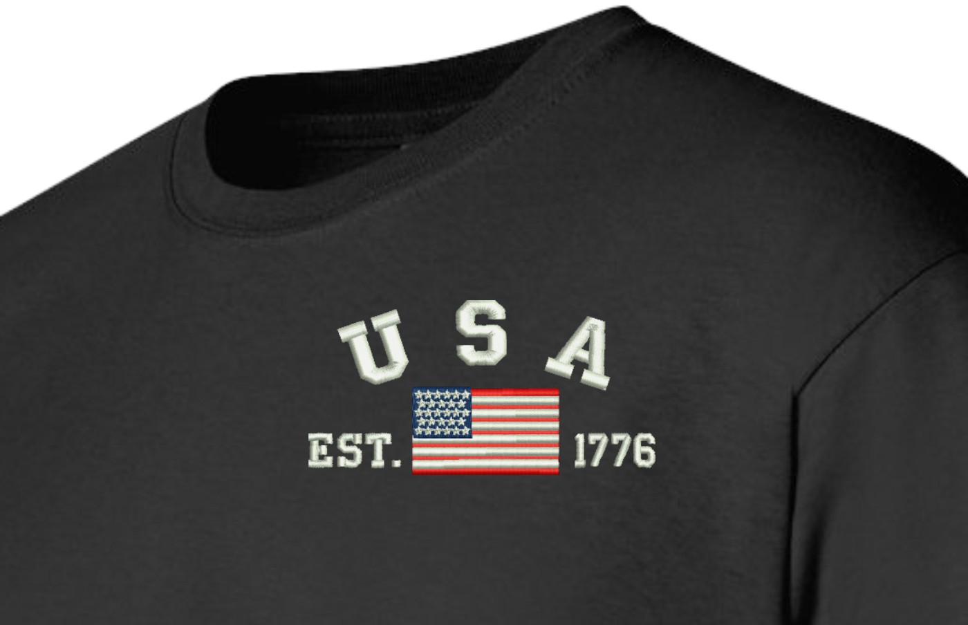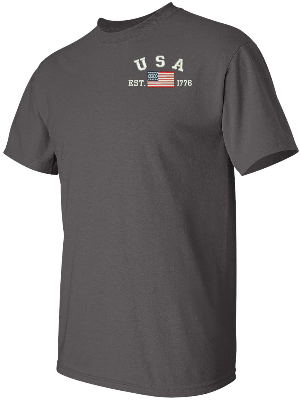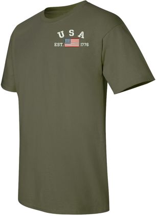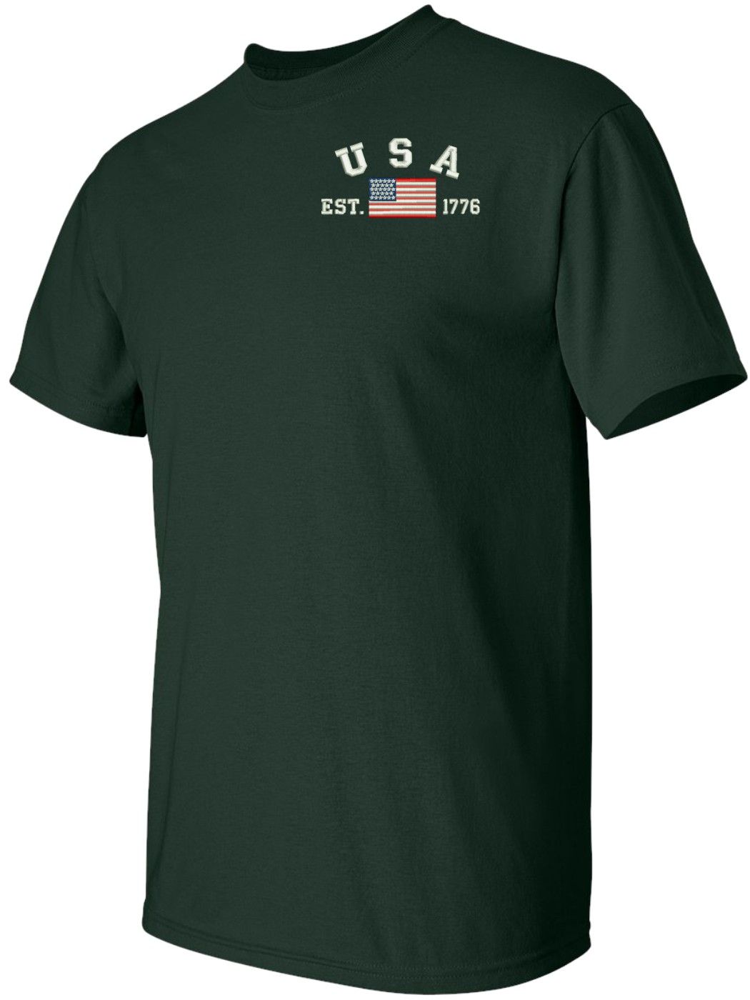 Note: Some of the Color Options pictured may not be available. Available Color Options are listed on the drop down menu above.MilitaryBest is expanding its line of apparel with this fine USA Est 1776 Embroidered T-Shirt. This short sleeve t-shirt is made using 100% cotton material. This shirt will make an excellent addition to your wardrobe or a fine gift. This Product is custom embroidered at our facilities in Scottsboro, AL when you place your order.