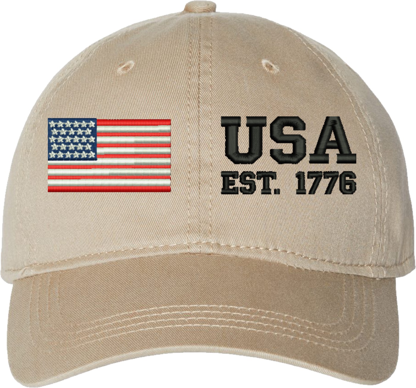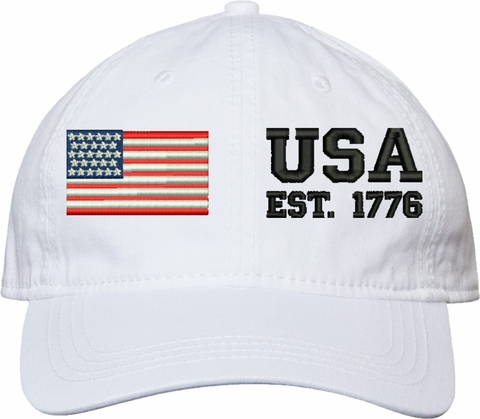 Celebrate 250 years of the United States of America! Show your pride with this USA Est 1776 (Split) Unstructured Dad Cap from MilitaryBest. Crafted from 100% washed chino twill cotton, this six-panel, low-profile cap offers a relaxed and comfortable fit. Featuring high-quality embroidery done in our Scottsboro, Alabama facility, this cap is designed with a pre-curved visor and an adjustable tri-glide buckle closure for a perfect fit. Whether for everyday wear or as a meaningful gift, this cap is a great way to honor your own or a loved one's service.For caps ordered with custom embroidered personalized text please allow an additional 3 to 5 days production time. All custom back text will be embroidered in ALL CAPITAL LETTERS. Caps with back text or eggs are non-returnable unless there is a material defect in the cap.