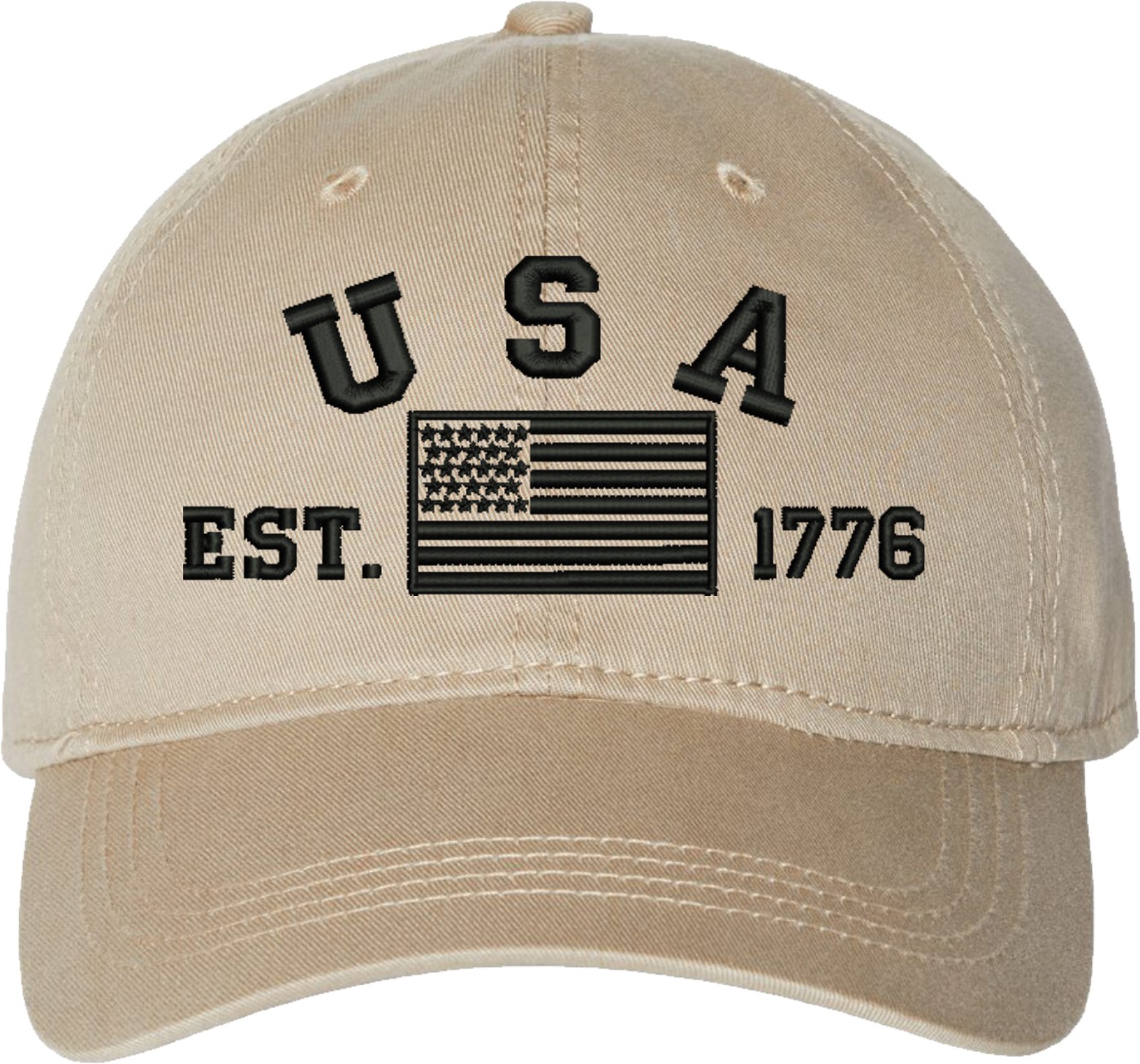 Celebrate 250 years of the United States of America! Show your pride with this USA Est 1776 Subdued Unstructured Dad Cap from MilitaryBest. Crafted from 100% washed chino twill cotton, this six-panel, low-profile cap offers a relaxed and comfortable fit. Featuring high-quality embroidery done in our Scottsboro, Alabama facility, this cap is designed with a pre-curved visor and an adjustable tri-glide buckle closure for a perfect fit. Whether for everyday wear or as a meaningful gift, this cap is a great way to honor your own or a loved one's service.For caps ordered with custom embroidered personalized text please allow an additional 3 to 5 days production time. All custom back text will be embroidered in ALL CAPITAL LETTERS. Caps with back text or eggs are non-returnable unless there is a material defect in the cap.