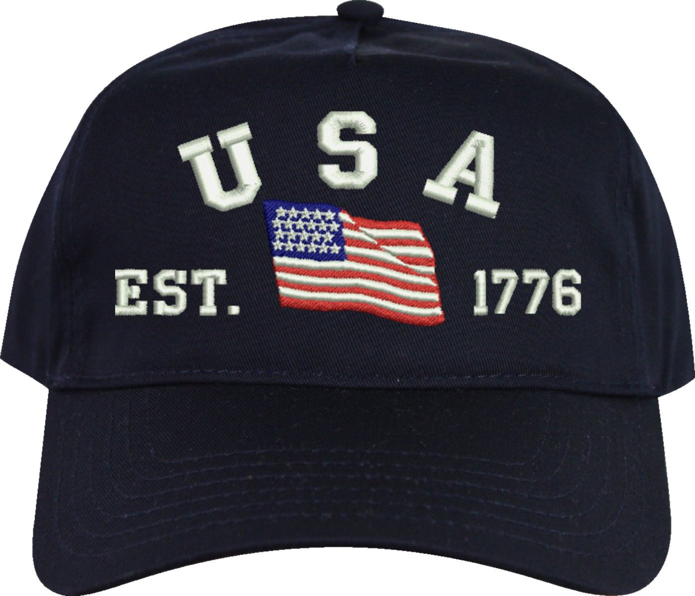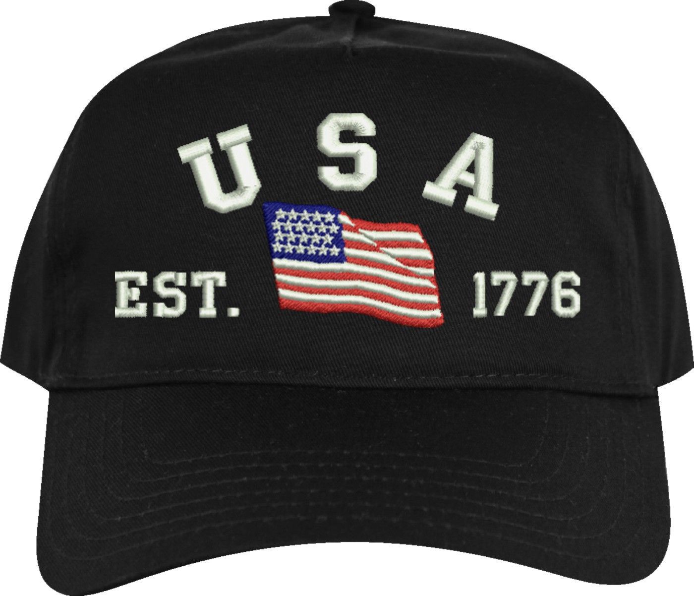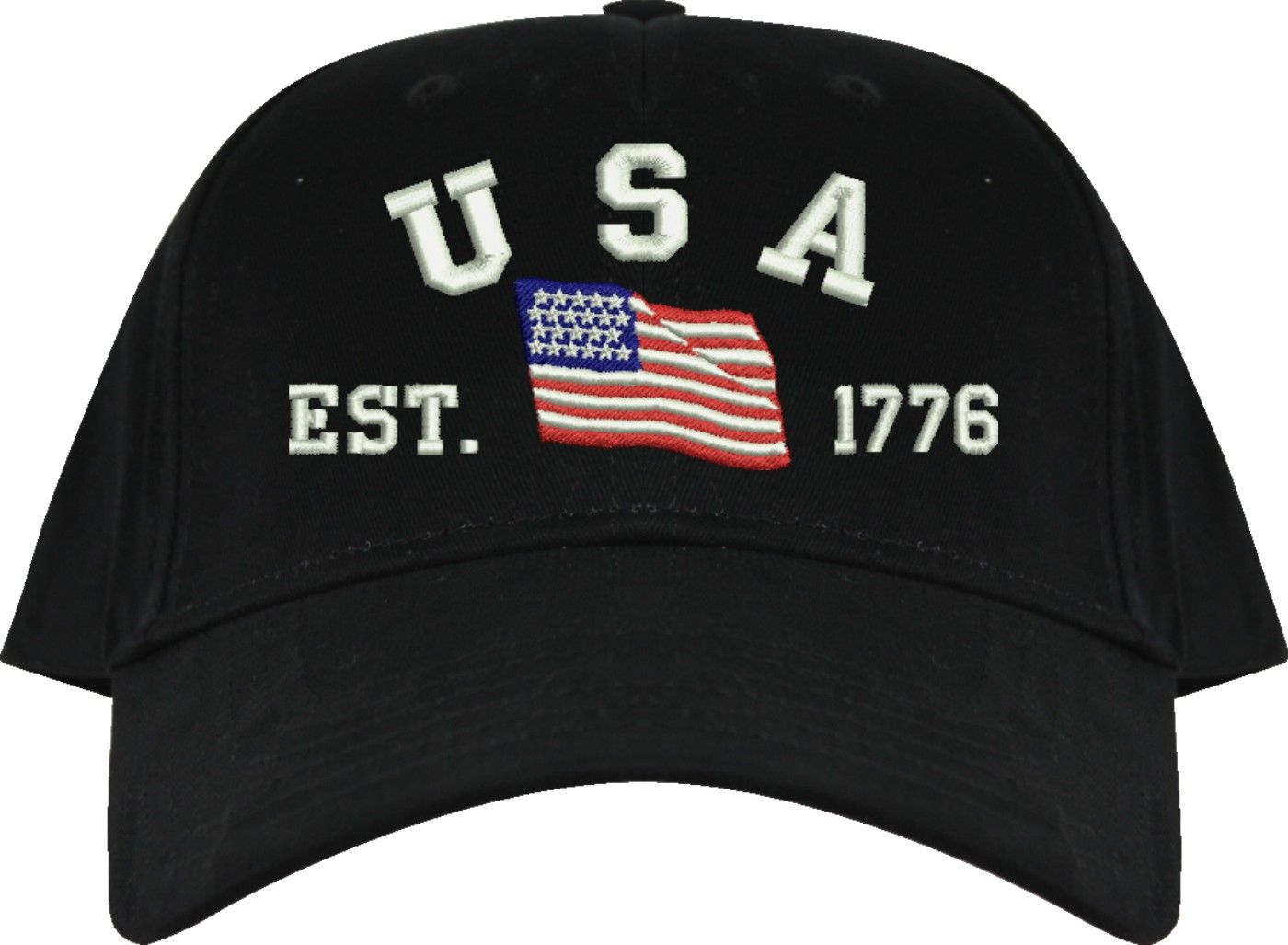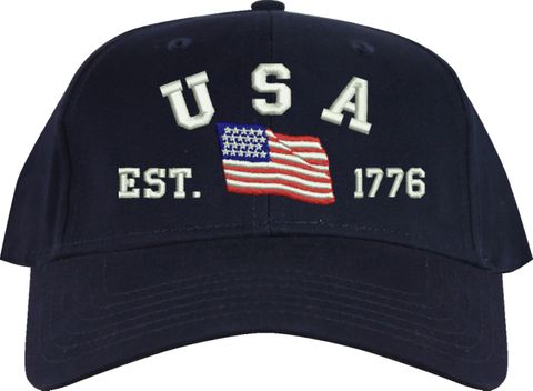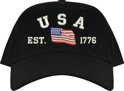 Celebrate 250 years of the United States of America! MilitaryBest is proud to offer this quality USA Est 1776 (Waving Flag) Embroidered Cap. This cap is available in either 5 panel high profile or 6 panel low profile styling. This cap will make a great addition to your collection or a great gift. This cap is crafted by our skilled embroidery technicians at our facilities in Scottsboro, AL. Your satisfaction is guaranteed!For caps ordered with custom embroidered personalized text please allow an additional 3 to 5 days production time. All custom text will be embroidered in ALL CAPS. Caps with custom text or eggs are non-returnable unless there is a material defect in the cap.