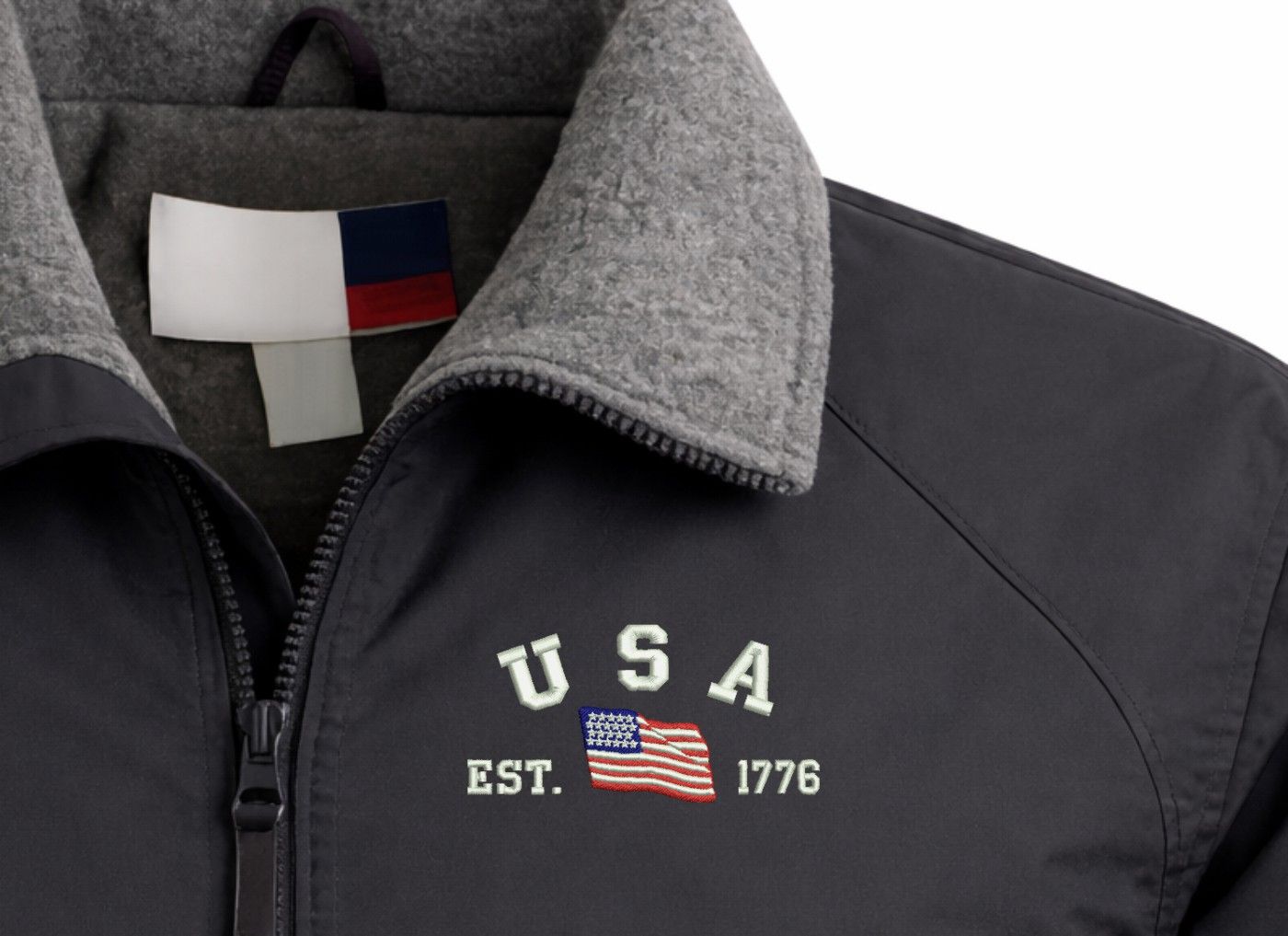 *** The brand of Jacket will vary, and may not match the brand pictured above. ***MilitaryBest is proud to offer this quality USA Est 1776 (Waving Flag) Embroidered Jacket. Each 3 season jacket is made from a 3-Layer system consisting of a nylon shell, an insulator layer, Nylon-lined sleeves, and an inside layer of fleece for comfort. Each jacket’s features include a sturdy black enamel front-zipper, raglan sleeves, outsize zip pockets, an inside zip security pocket, YKK zippers, and a banded-bottom. As with all MilitaryBest products, your satisfaction is guaranteed! This jacket can be worn in fall, winter, and spring and is proudly custom embroidered at our facilities in Scottsboro, AL.