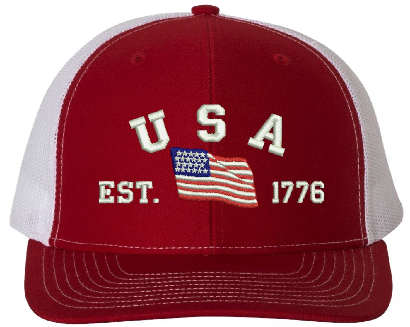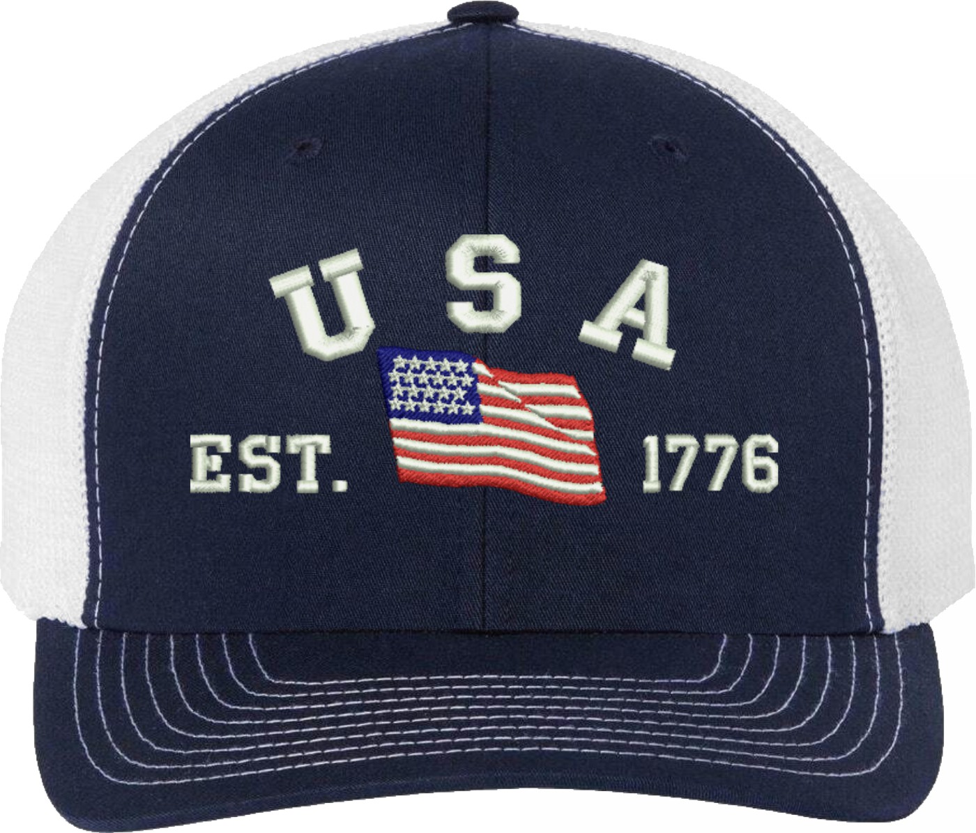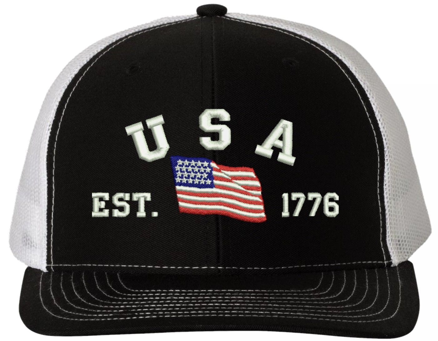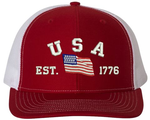 Celebrate 250 Years of the United States of America! MilitaryBest is proud to offer this USA Est 1776 (Waving Flag) Embroidered Mesh-Back Cap. This Mesh-Back Cap is expertly crafted by our skilled embroidery technicians at our facilities in Scottsboro, Alabama. As with all MilitaryBest items, your satisfaction is guaranteed!For caps ordered with custom embroidered personalized text please allow an additional 3 to 5 days production time. All custom back text will be embroidered in ALL CAPITAL LETTERS. Caps with back text or eggs are non-returnable unless there is a material defect in the cap.