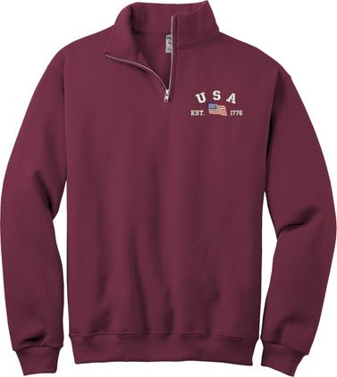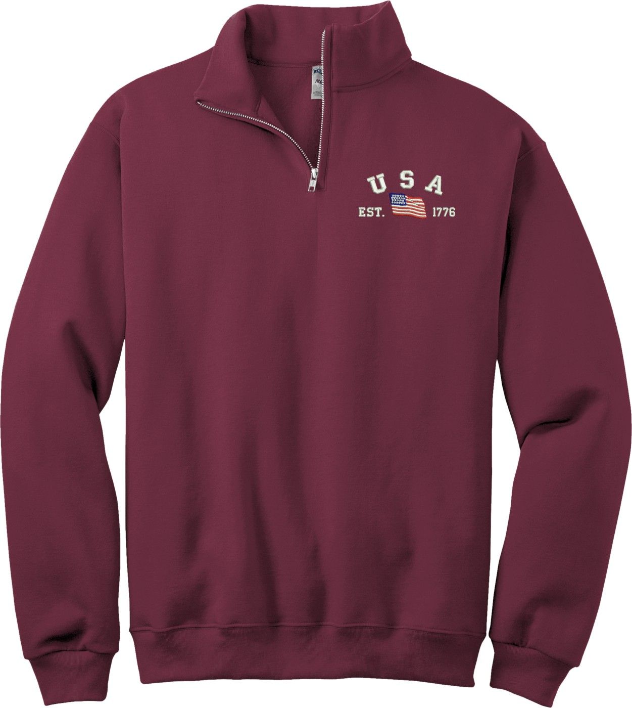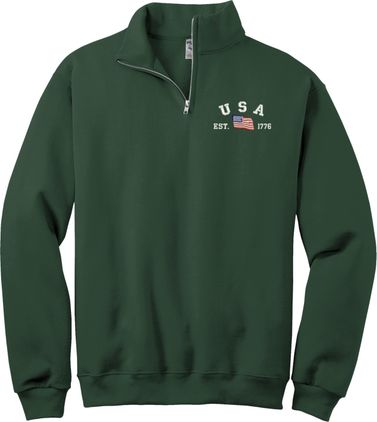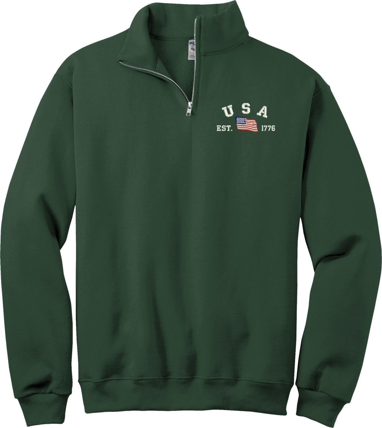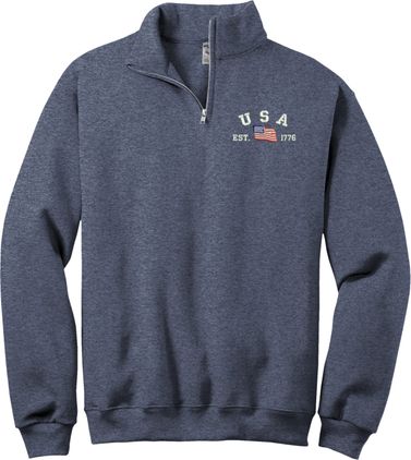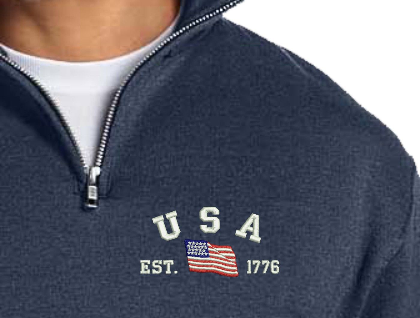 *** The brand of shirt will vary, and may not match the brand pictured above. ***MilitaryBest is proud to offer this USA Est 1776 (Waving Flag) Embroidered Quarter-Zip Pullover. This quality pullover is embroidered by our MilitaryBest team in Northeast Alabama.