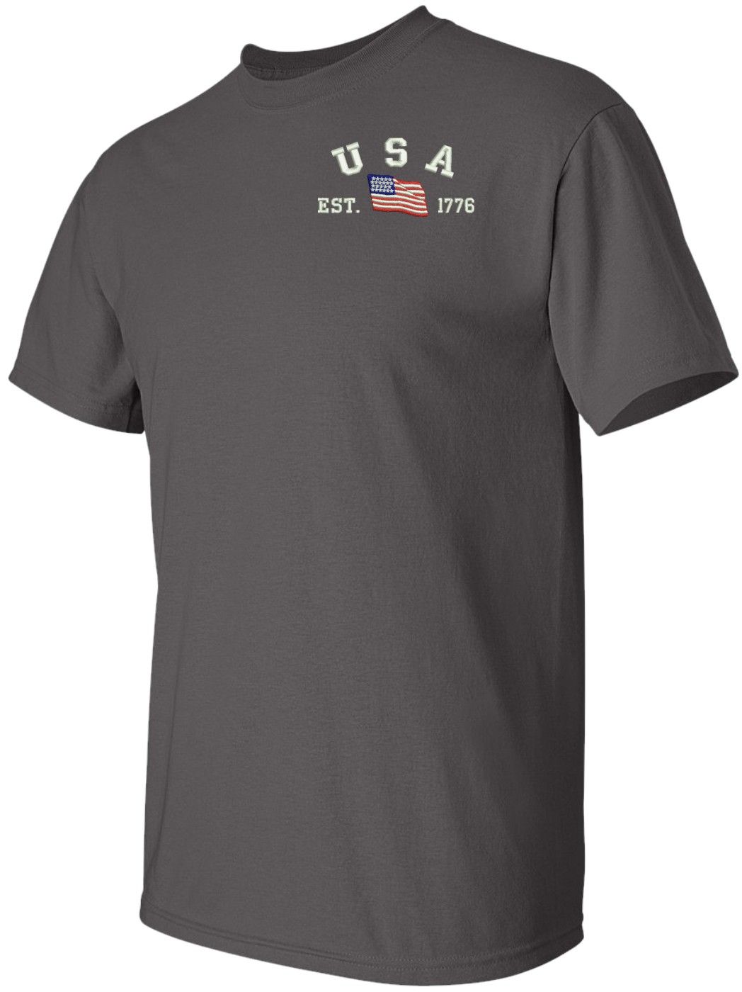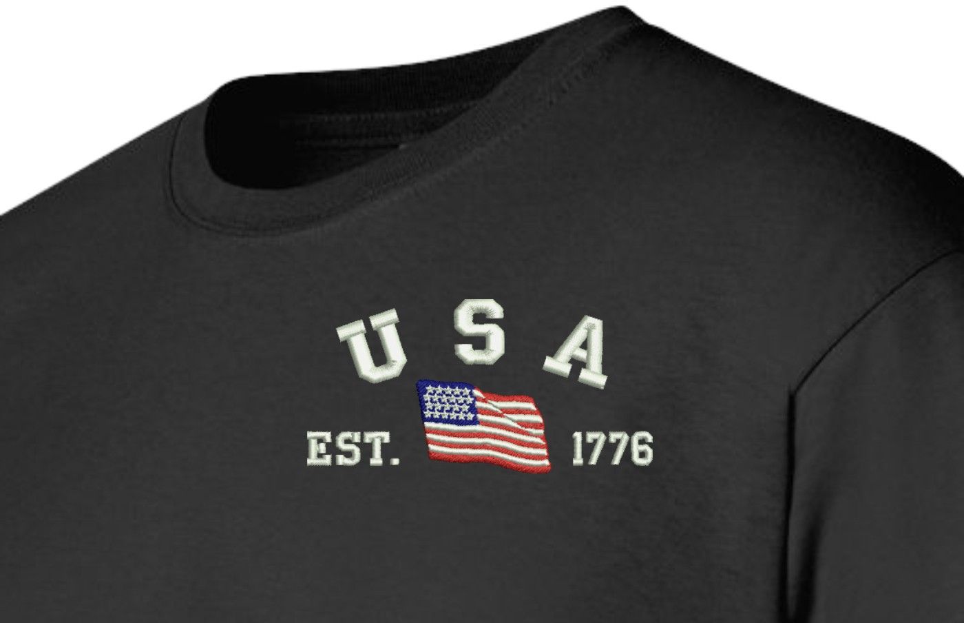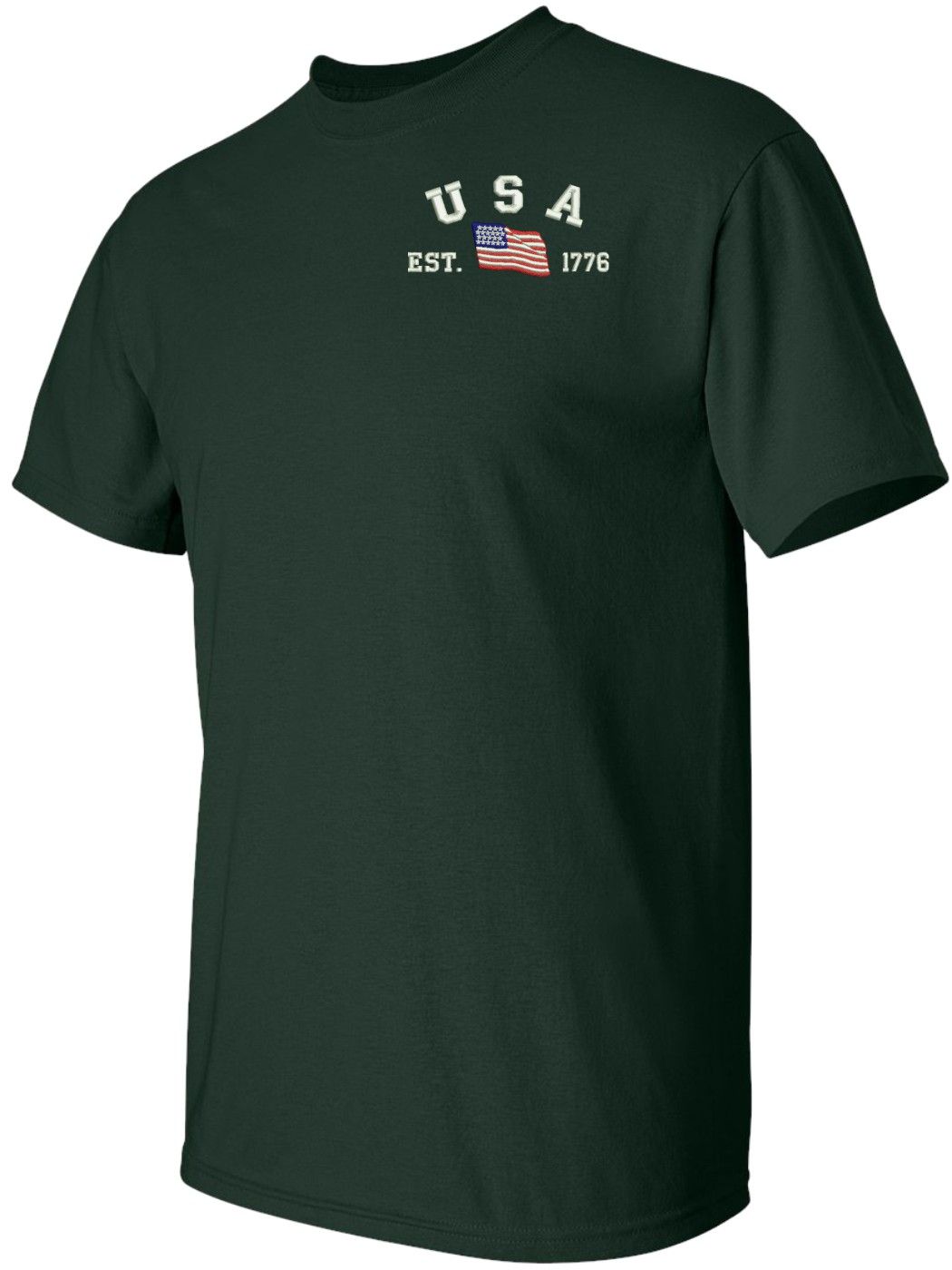 Note: Some of the Color Options pictured may not be available. Available Color Options are listed on the drop down menu above.MilitaryBest is expanding its line of apparel with this fine USA Est 1776 (Waving Flag) Embroidered T-Shirt. This short sleeve t-shirt is made using 100% cotton material. This shirt will make an excellent addition to your wardrobe or a fine gift. This Product is custom embroidered at our facilities in Scottsboro, AL when you place your order.