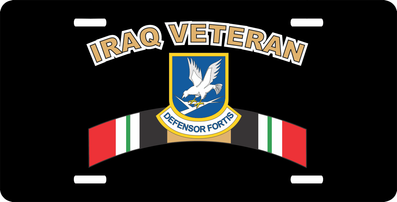 This USAF Defensor Fortis Iraq Veteran License Plate is made from heavy gauge aluminum and has a baked enamel finish to last for many years of use. Each plate measures 5 15/16" x 11 15/16". This license plate would make a wonderful addition to your collection or a great gift.
