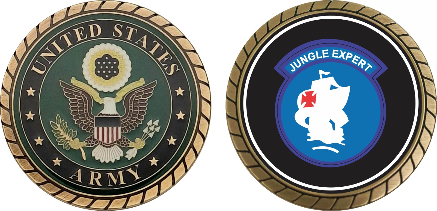 This 1 3/4” USARSO Jungle Expert Challenge Coin is proudly offered by Militarybest. This Officially Licensed Army coin has beautiful enamel finish on one side and an organized crisp clean design on the opposite side.