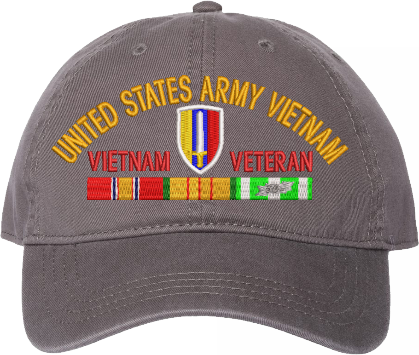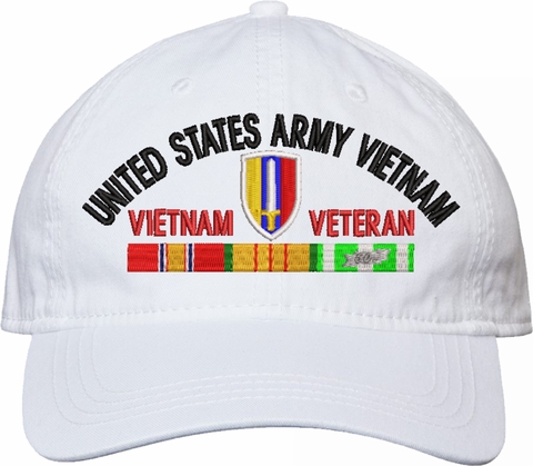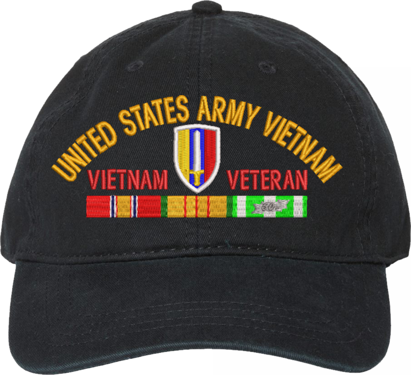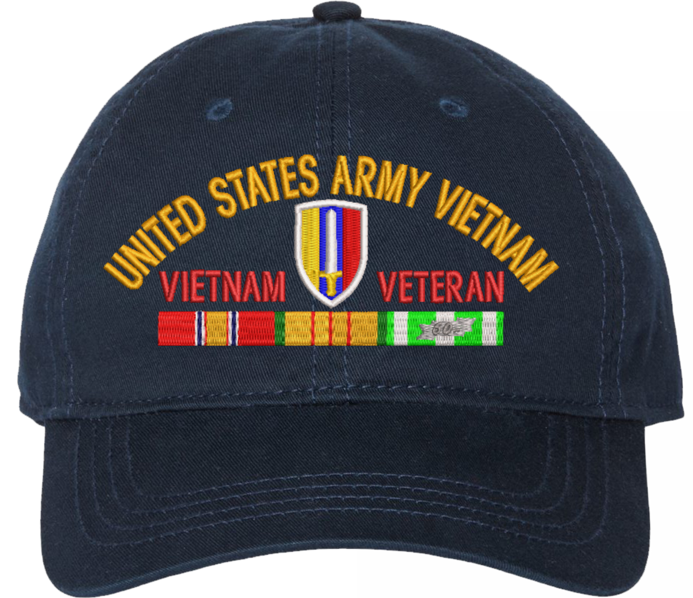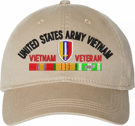 Show your Army pride with this USARV Vietnam Veteran with Ribbons Unstructured Dad Cap from MilitaryBest. Crafted from 100% washed chino twill cotton, this six-panel, low-profile cap offers a relaxed and comfortable fit. Featuring high-quality embroidery done in our Scottsboro, Alabama facility, this cap is designed with a pre-curved visor and an adjustable tri-glide buckle closure for a perfect fit. Whether for everyday wear or as a meaningful gift, this cap is a great way to honor your own or a loved one's service.For caps ordered with custom embroidered personalized text please allow an additional 3 to 5 days production time. All custom back text will be embroidered in ALL CAPITAL LETTERS. Caps with back text or eggs are non-returnable unless there is a material defect in the cap.