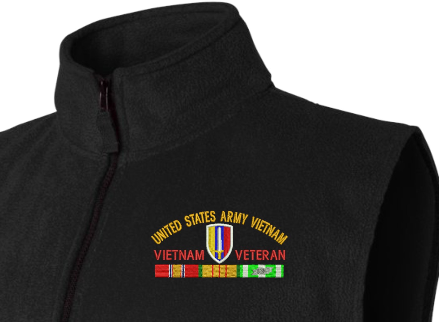 Note: Due to supply chain disruptions, some colors and sizes may not be available in the same brand, in these cases a brand of comarable quality will be used. Feel free to call in advance of your order, with questions you may have.MilitaryBest is proud to offer this quality U.S. Army USARV Vietnam Veteran with Ribbons Embroidered Fleece Vest. This Fleece Vest features a convertible collar with dyed-to-match zipper pull, oversized nylon reinforced slash pockets, and an elastic hem. It is made using a 100% anti-pill polyester Fleece Vest. This Fleece Vest will make an excellent addition to your wardrobe, or a quality gift. Your satisfaction is guaranteed! These quality fleece vests are proudly embroidered at our facilities in Scottsboro, AL. Support the Army MWR program by purchasing only from Licensed Vendors. To all of our Vietnam Veterans, Welcome Home!