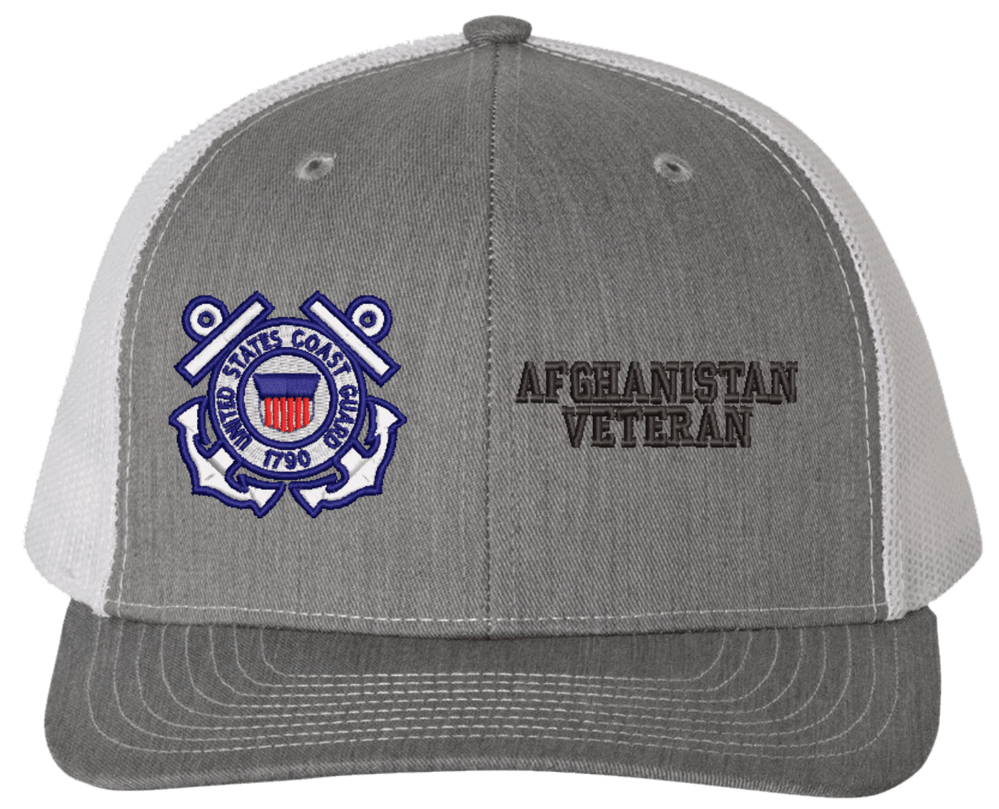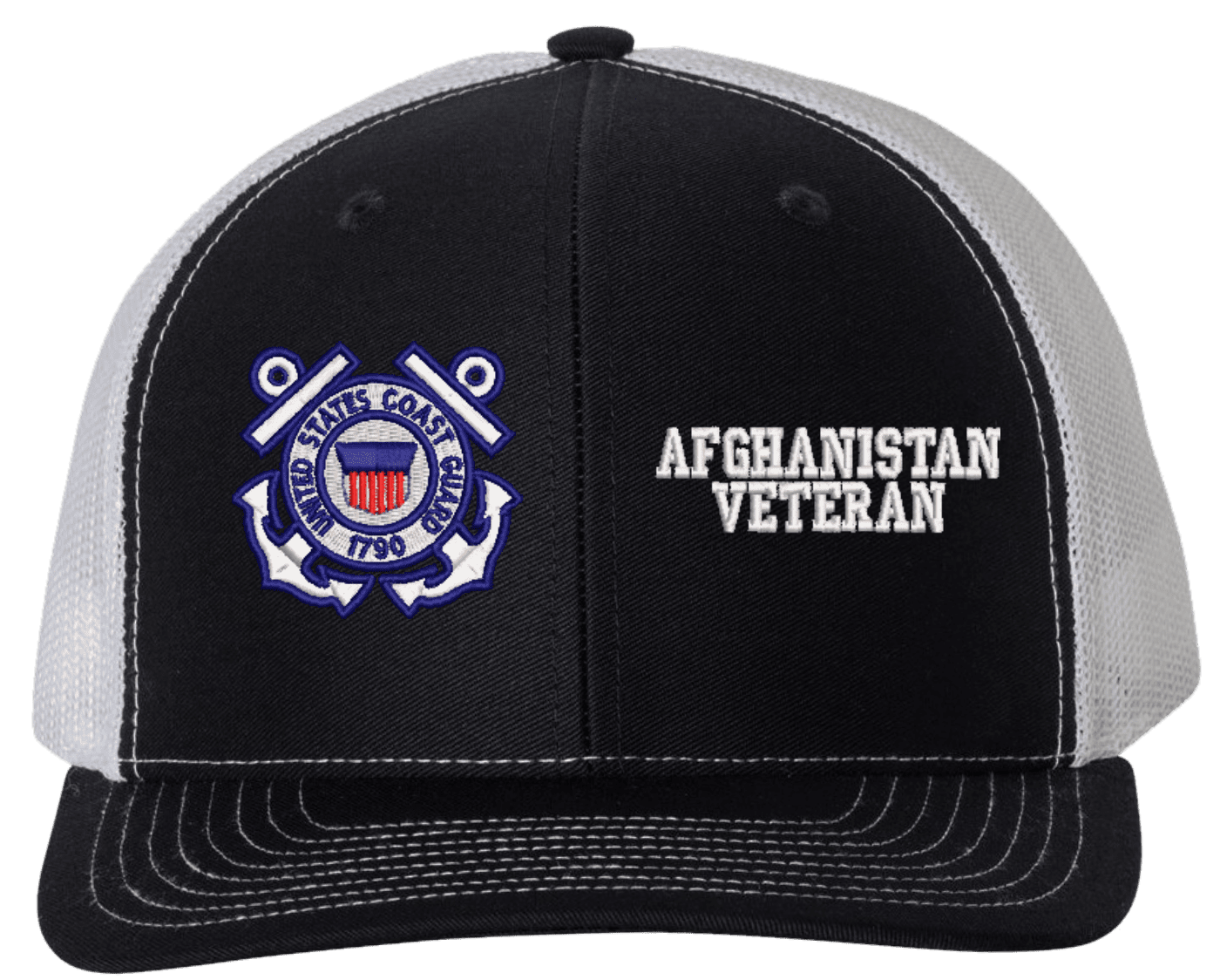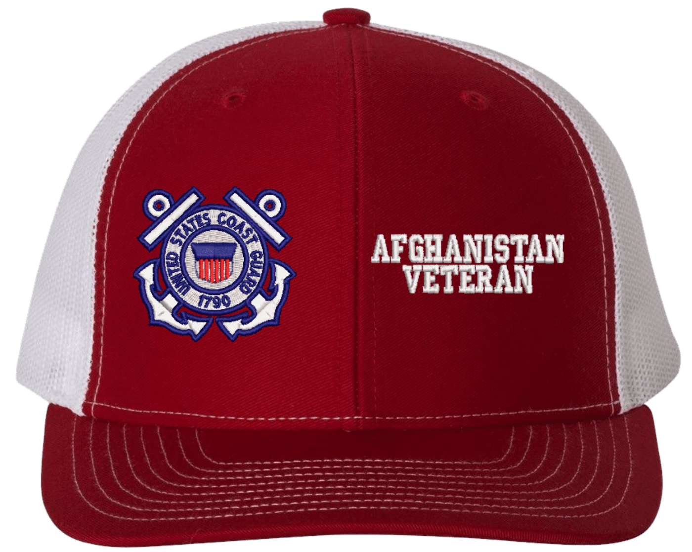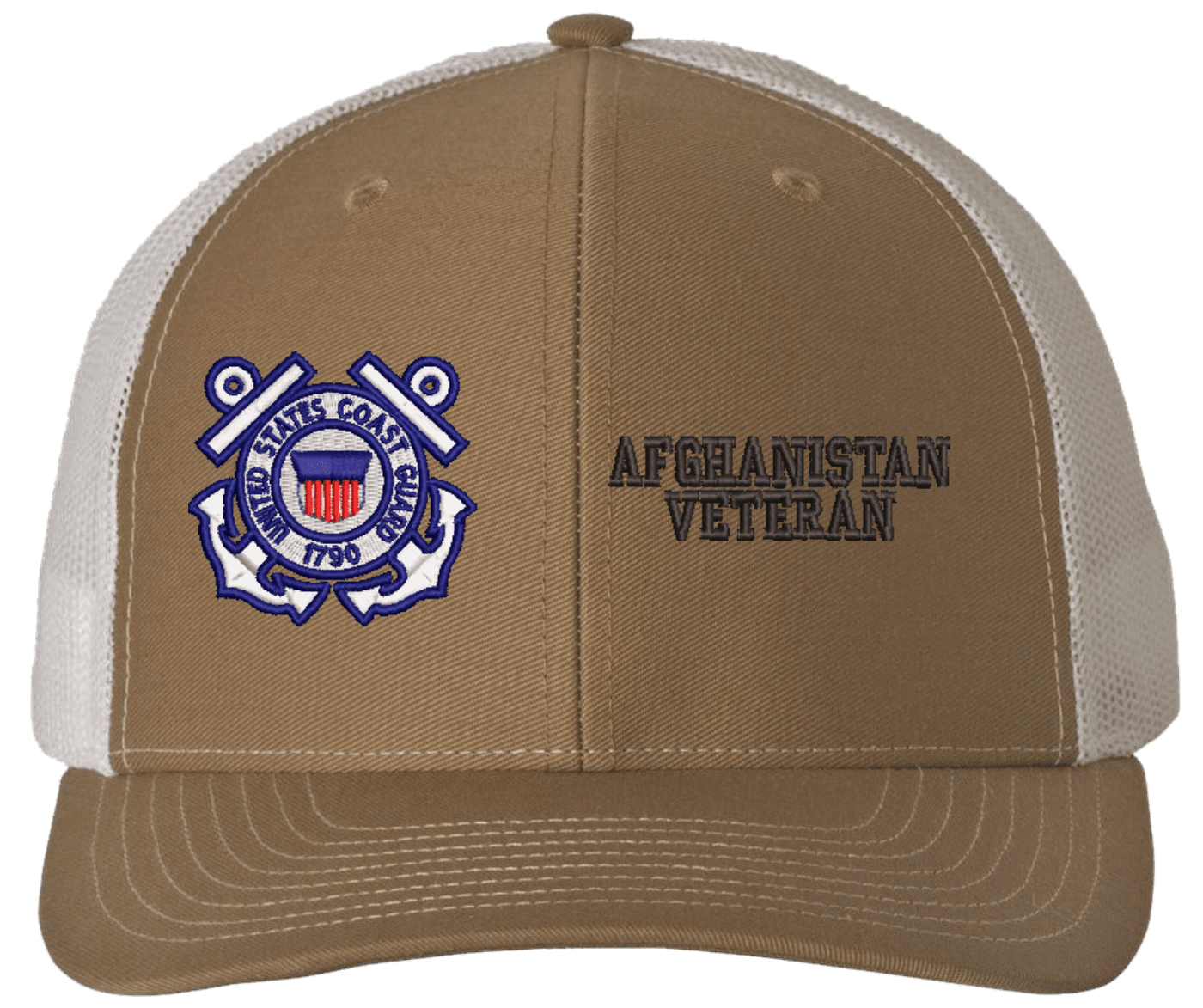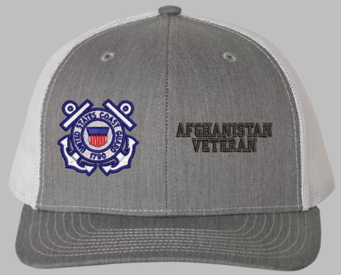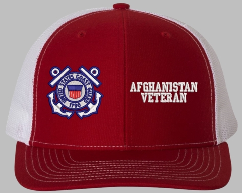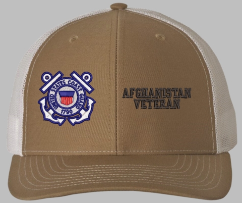 MilitaryBest is proud to offer this U.S. Coast Guard Afghanistan Veteran Mesh Back Cap. The design of this U.S. Coast Guard Cap is crisp, clean, and sure to be loved by people of all ages! Select above from our many cap colors. This U.S. Coast Guard Afghanistan Veteran Mesh Back Cap is crafted by our skilled embroidery technicians at our facilities in Scottsboro, AL. As with all MilitaryBest items, your satisfaction is guaranteed!Caps ordered with custom embroidered personalized back text require an additional 2 to 3 days production time. All custom back text will be embroidered in ALL CAPITAL LETTERS. Caps personalized with back text are non-returnable unless there is a material defect in the cap.