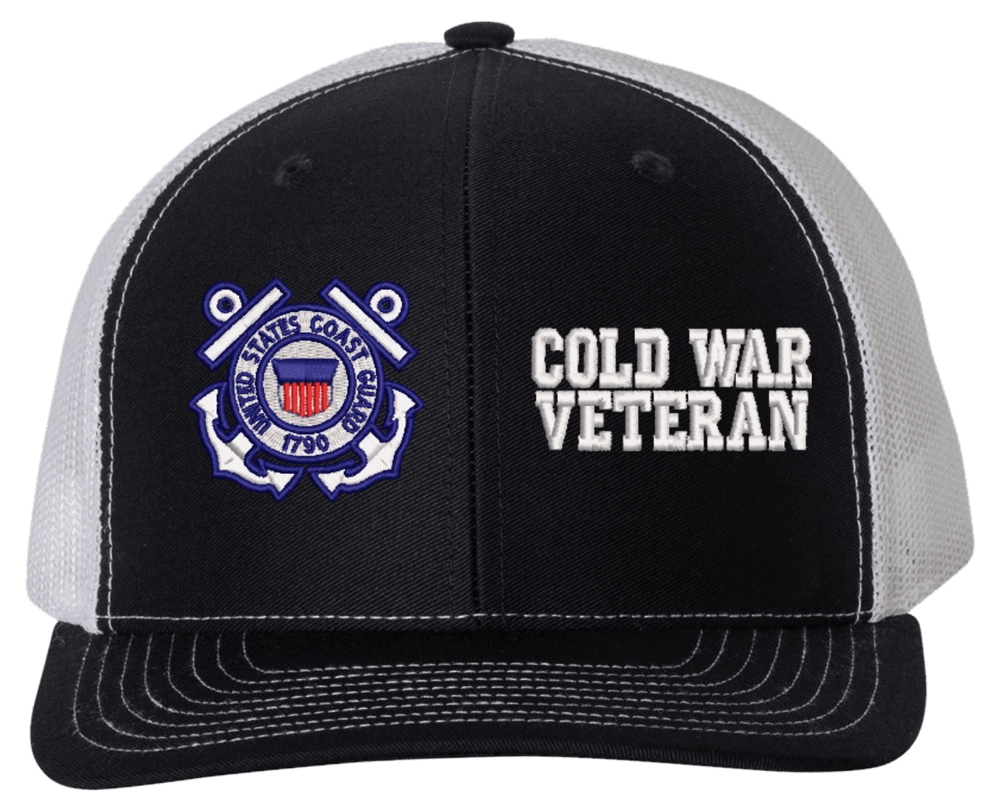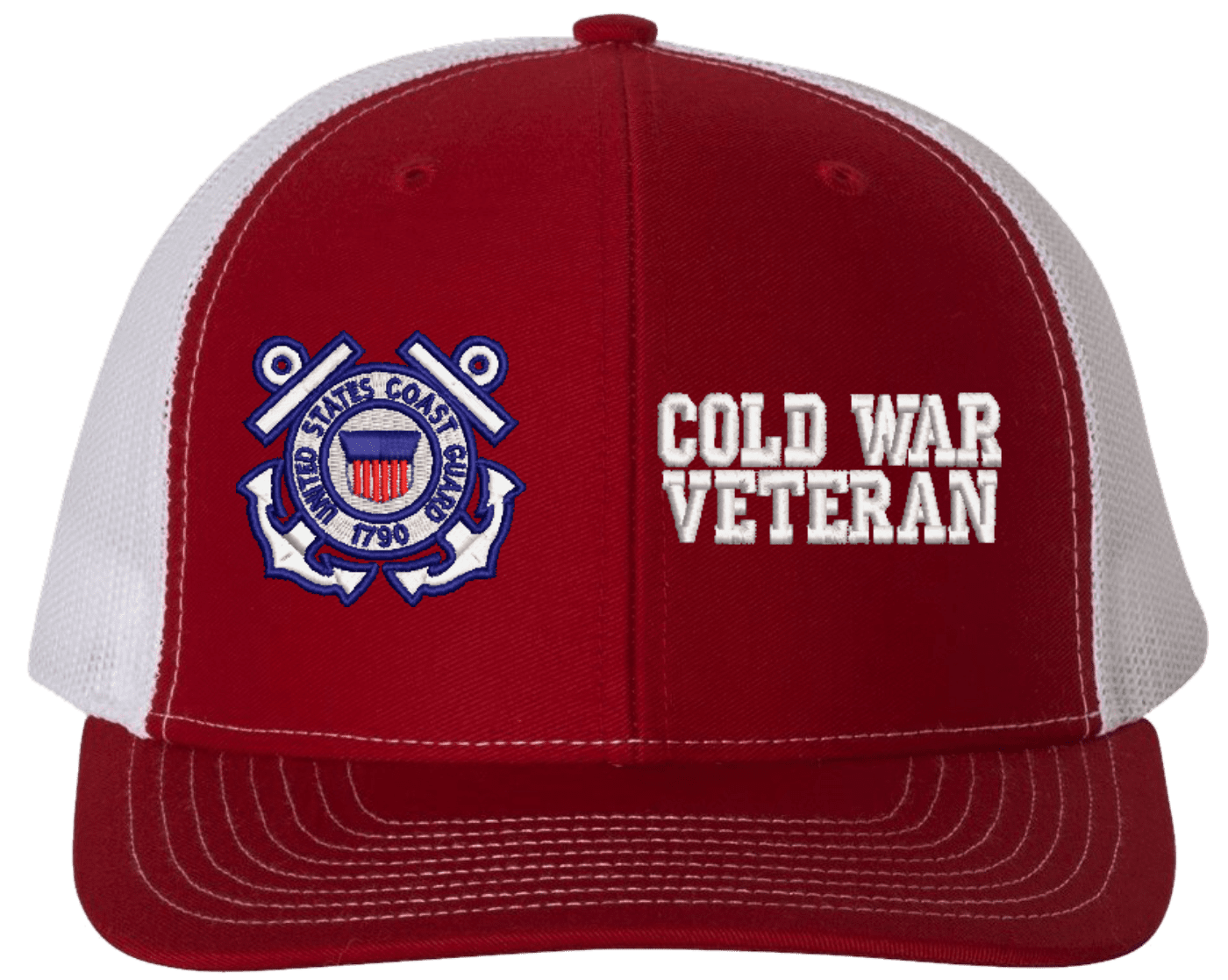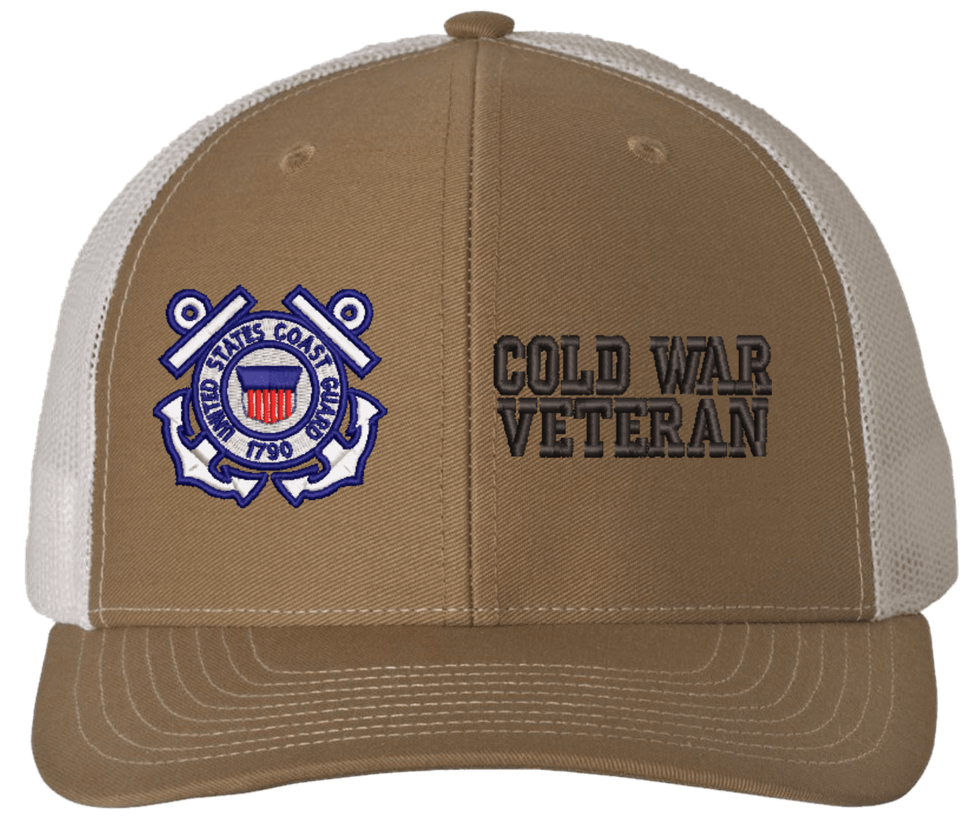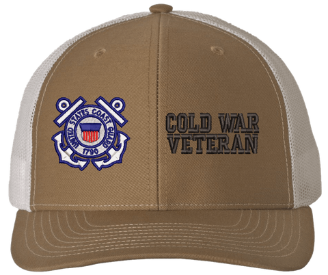 MilitaryBest is proud to offer this U.S. Coast Guard Cold War Veteran Mesh Back Cap. The design of this U.S. Coast Guard Cap is crisp, clean, and sure to be loved by people of all ages! Select above from our many cap colors. This U.S. Coast Guard Cold War Veteran Mesh Back Cap is crafted by our skilled embroidery technicians at our facilities in Scottsboro, AL. As with all MilitaryBest items, your satisfaction is guaranteed!Caps ordered with custom embroidered personalized back text require an additional 2 to 3 days production time. All custom back text will be embroidered in ALL CAPITAL LETTERS. Caps personalized with back text are non-returnable unless there is a material defect in the cap.