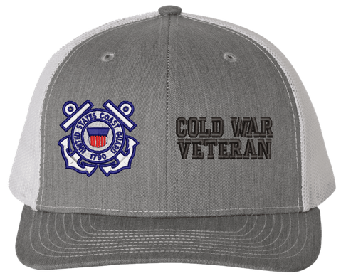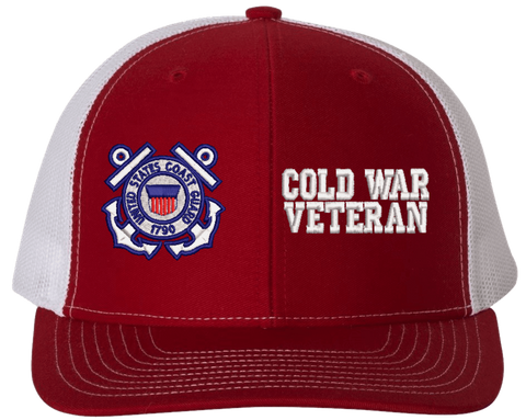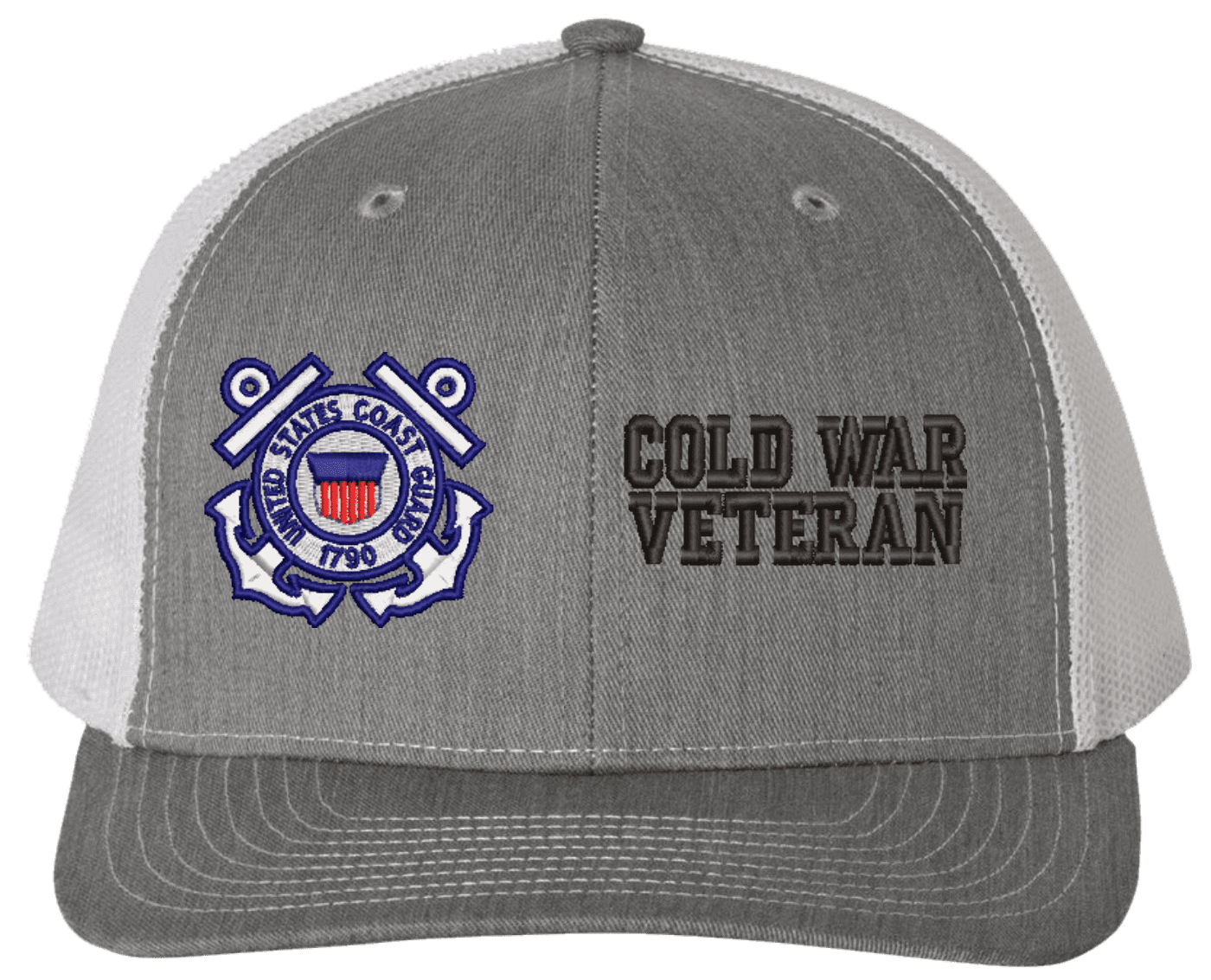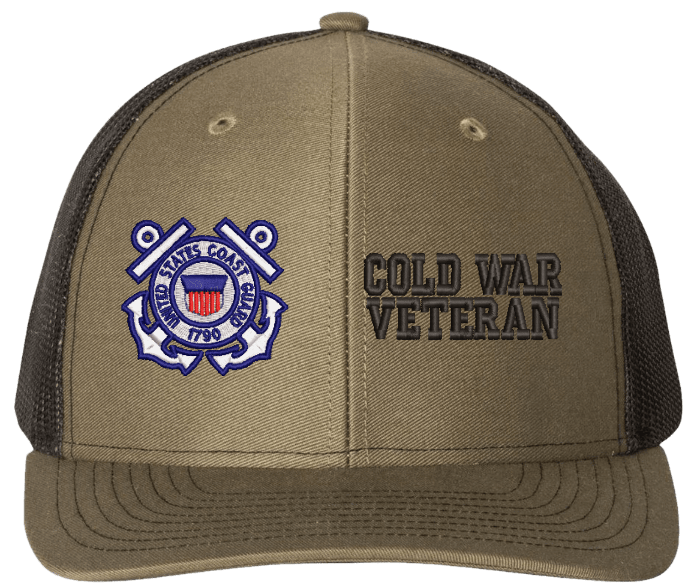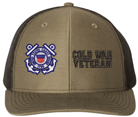 MilitaryBest is proud to offer this U.S. Coast Guard Cold War Veteran Mesh Back Cap. The design of this U.S. Coast Guard Cap is crisp, clean, and sure to be loved by people of all ages! Select above from our many cap colors. This U.S. Coast Guard Cold War Veteran Mesh Back Cap is crafted by our skilled embroidery technicians at our facilities in Scottsboro, AL. As with all MilitaryBest items, your satisfaction is guaranteed!Caps ordered with custom embroidered personalized back text require an additional 2 to 3 days production time. All custom back text will be embroidered in ALL CAPITAL LETTERS. Caps personalized with back text are non-returnable unless there is a material defect in the cap.