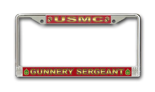 U.S.M.C. 'Gunnery Sergeant' License Plate FrameThis Marine Corps 'Gunnery Sergeant' License Plate Frame is made from the highest quality chrome finished metal alloy. Each one is designed to provide years of use. Each is designed in our facility in Scottsboro, Alabama.