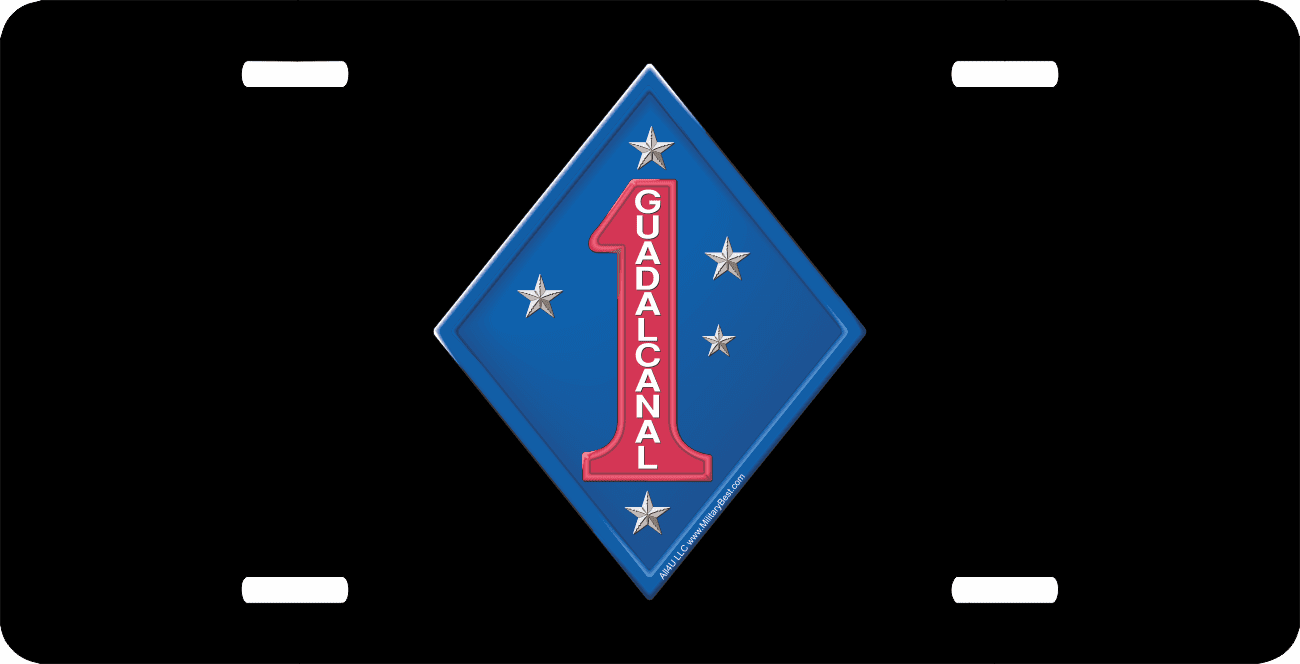 This USMC 1st Marine Division Guadalcanal License Plate is made from heavy gauge aluminum and has a baked enamel finish to last for many years of use. Each plate measures 5 15/16" x 11 15/16". This license plate would make a wonderful addition to your collection or a great gift.