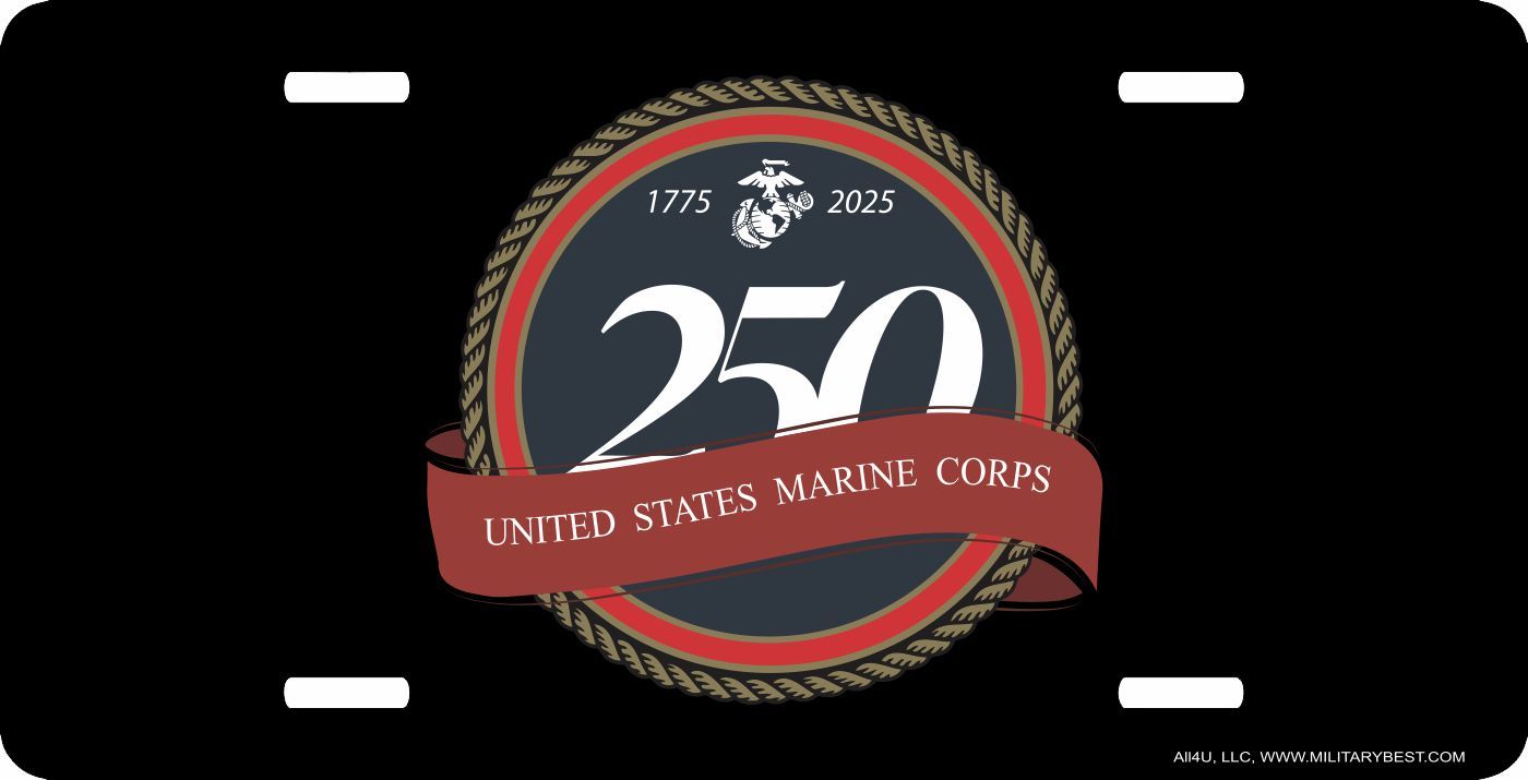 This U.S. Marine Corps 250th Anniversary Seal License Plate is made from heavy gauge aluminum and has a baked enamel finish to last for many years of use. Each plate measures 5 15/16" x 11 15/16". This license plate would make a wonderful addition to your collection or a great gift.