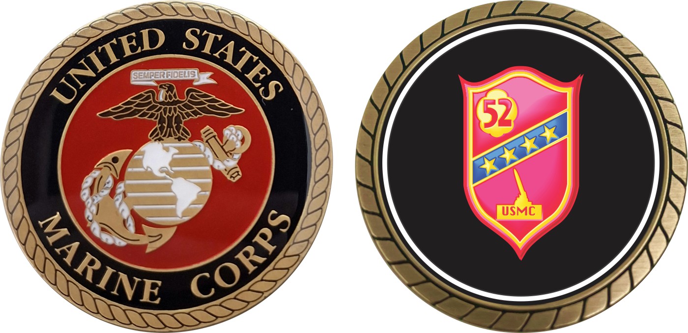 This 1 3/4” U.S.M.C. 52nd Defense Battalion Challenge Coin is proudly offered by Militarybest. This Officially Licensed Marine Corps coin has beautiful enamel finish on one side and an organized crisp clean design on the opposite side.