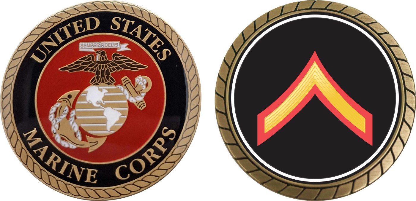 This 1 3/4” U.S.M.C. E-2 Private First Class Red / Gold Chevron Challenge Coin is proudly offered by Militarybest. This Officially Licensed Marine Corps coin has beautiful enamel finish on one side and an organized crisp clean design on the opposite side.