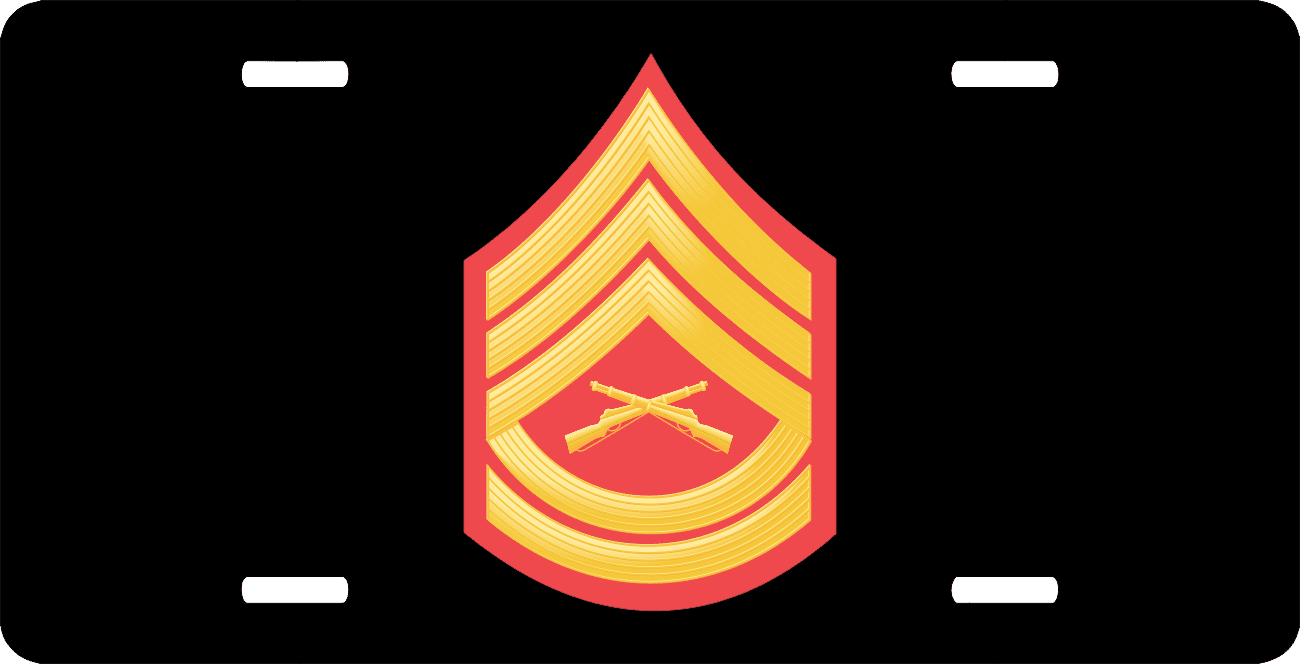 This USMC E-7 Gunnery Sergeant Red Gold Chevron License Plate is made from heavy gauge aluminum and has a baked enamel finish to last for many years of use. Each plate measures 5 15/16" x 11 15/16". This license plate would make a wonderful addition to your collection or a great gift.