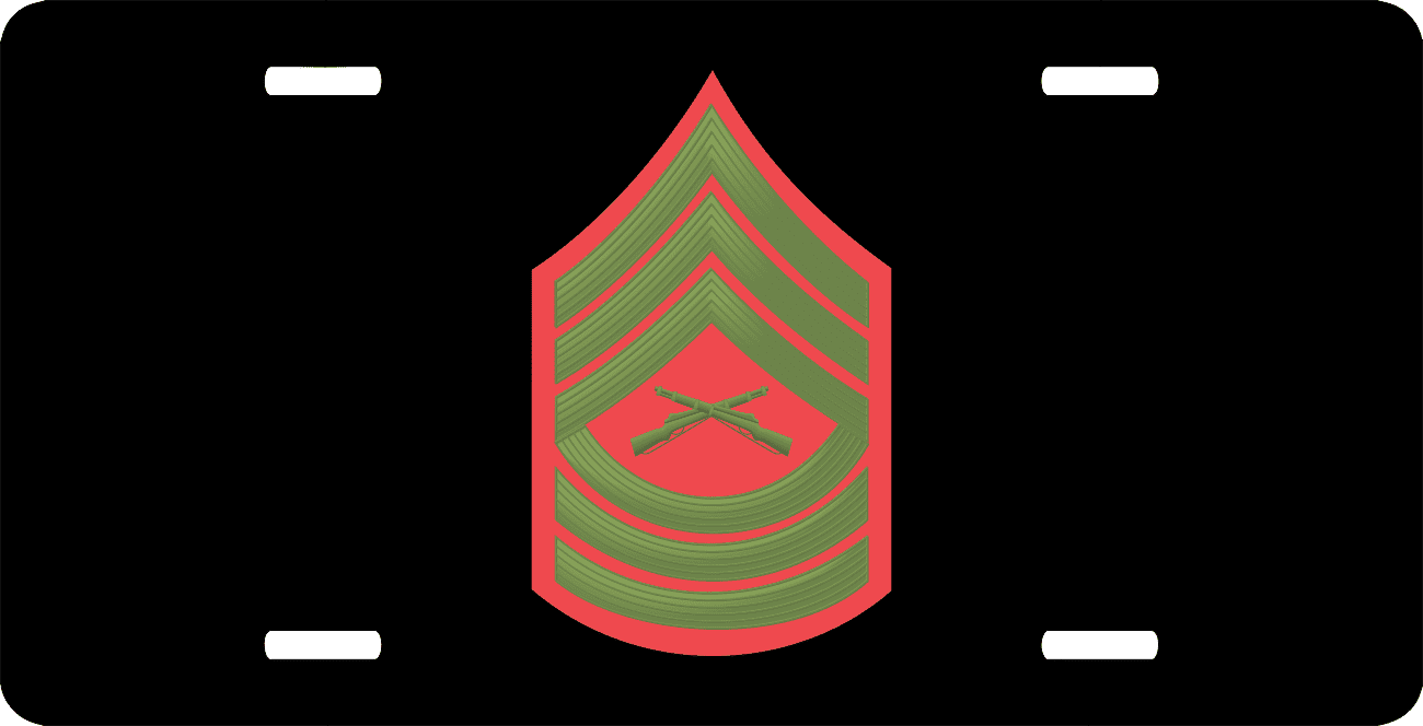 This USMC E-8 Master Sergeant Green Red Chevron License Plate is made from heavy gauge aluminum and has a baked enamel finish to last for many years of use. Each plate measures 5 15/16" x 11 15/16". This license plate would make a wonderful addition to your collection or a great gift.