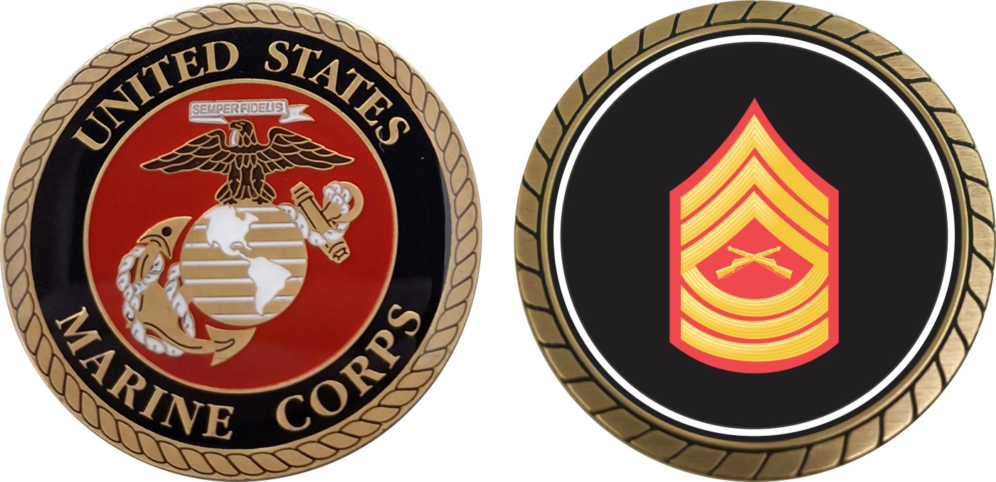 This 1 3/4” U.S.M.C. E-8 Master Sergeant Red / Gold Chevron Challenge Coin is proudly offered by Militarybest. This Officially Licensed Marine Corps coin has beautiful enamel finish on one side and an organized crisp clean design on the opposite side.