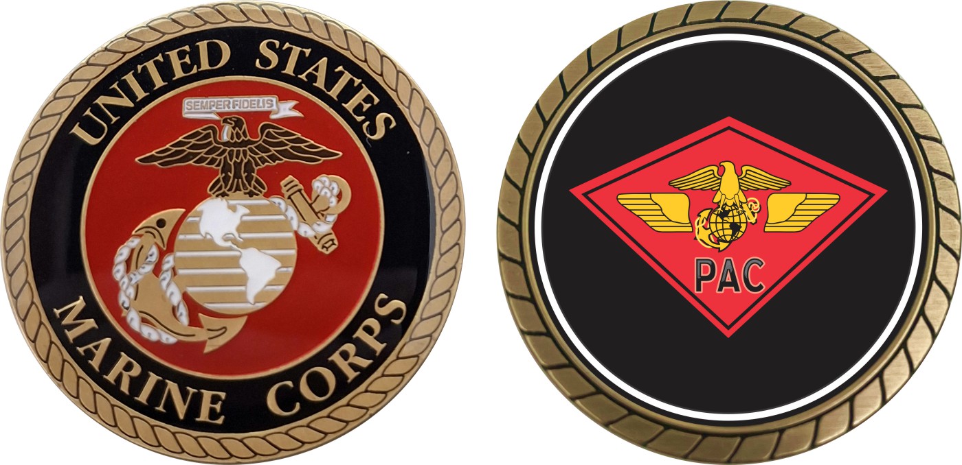 This 1 3/4” U.S.M.C. Headquarter Pacific Marine Air Wing Challenge Coin is proudly offered by Militarybest. This Officially Licensed Marine Corps coin has beautiful enamel finish on one side and an organized crisp clean design on the opposite side.